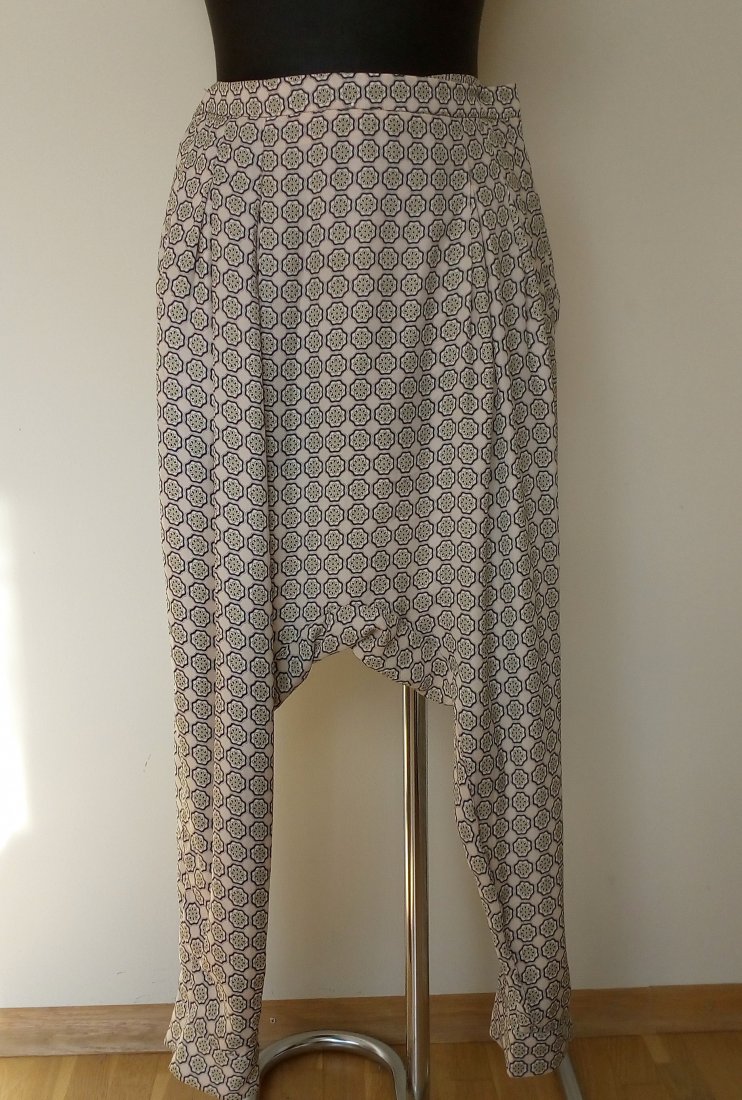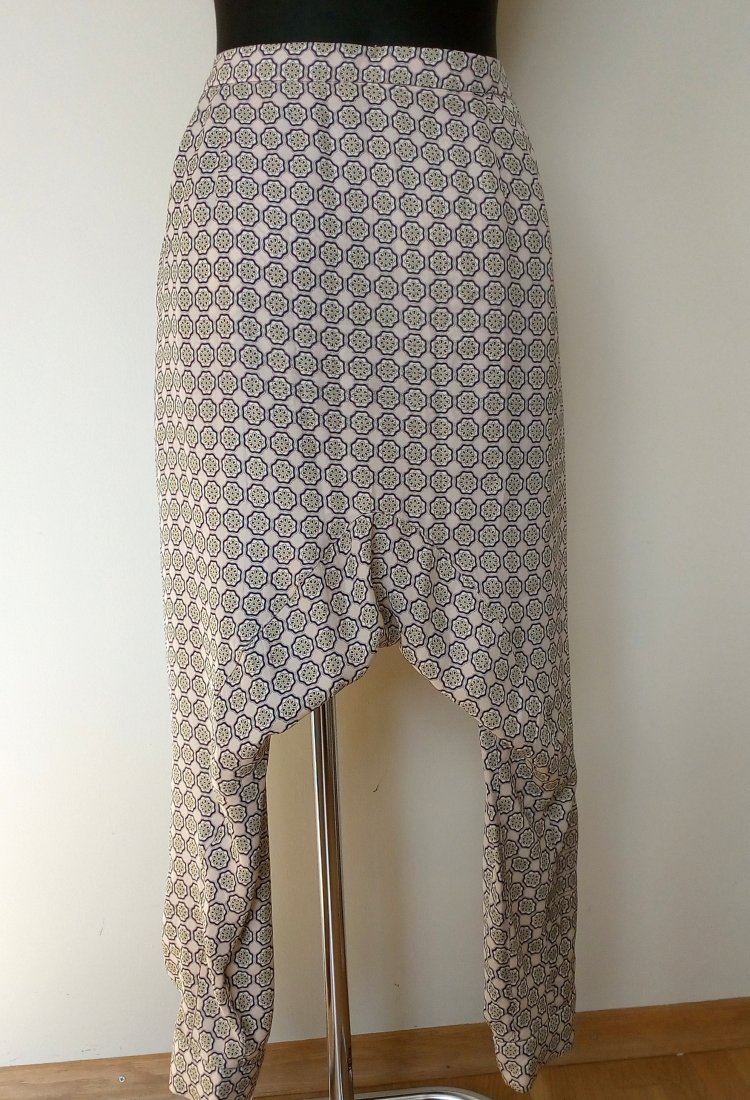 Spodnie z mocno obniżanym krokiem, zapinane z boku na zamek, z przodu po dwie boczne kontrafałdy i ukośnie wpuszczane kieszenie, nogawki u dołu wąskie z doszywanym mankietem, zapinane z boku, po zewnętrznej stronie na plastykowy zamek