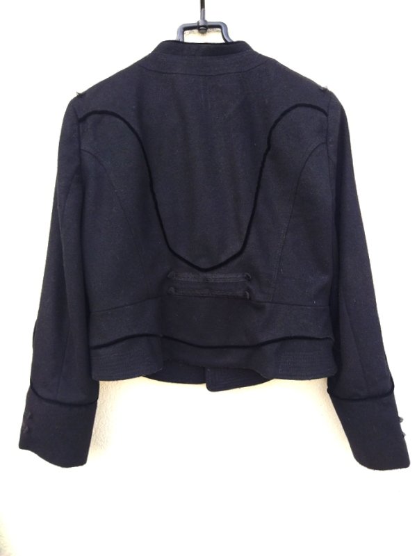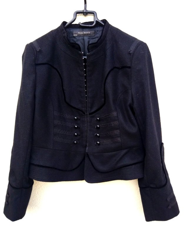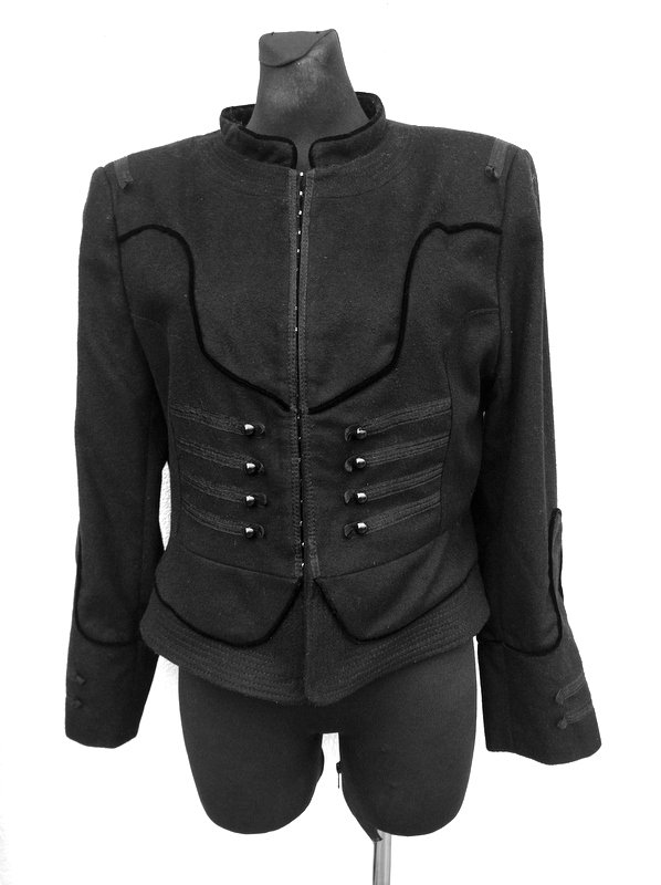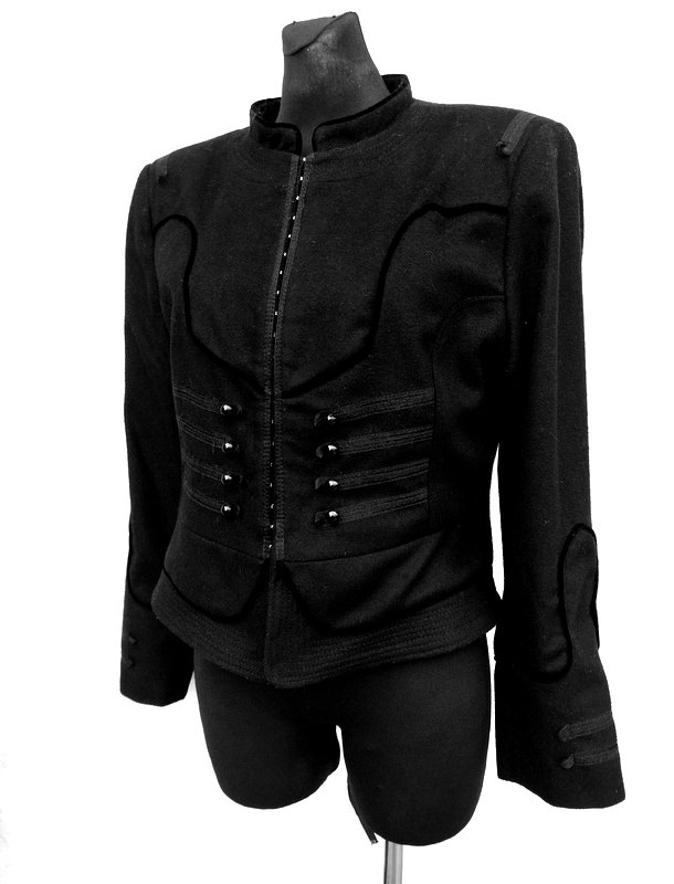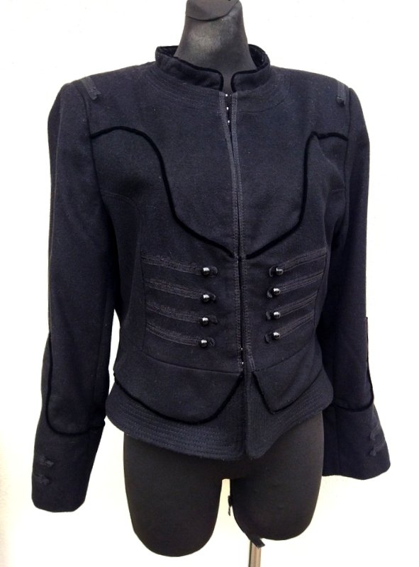 Nietuzinkowa ciepła marynarka lub kurtka z wełnianej tkaniny z dodatkiem poliamidu, w czarnym kolorze. Starannie uszyta z licznymi detalami. Zdobiona wypukłymi aksamitnymi lamówkami wkomponowanymi w szwy i naszywanymi szyfonowymi tasiemkami z przodu z kulistymi guzikami imitującymi zapięcie. Taliowana , na stójce pod szyją, zapinana od wewnątrz na metalowe haftki. Całość na podszewce.