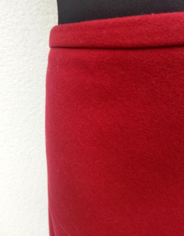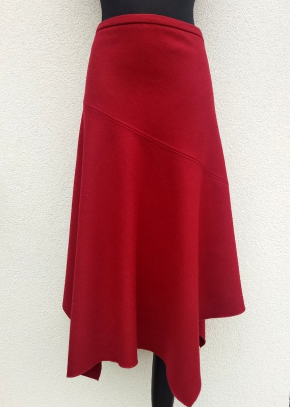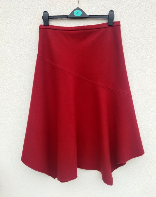 Świetna spódnica midi z wełnianej tkaniny z w kolorze jarzębinowej czerwieni. Dopasowana w biodrach od bioder rozkloszowana z asymetrycznym dołem. Na pasku w talii. Zapinana z boku na zamek. Na podszewce.