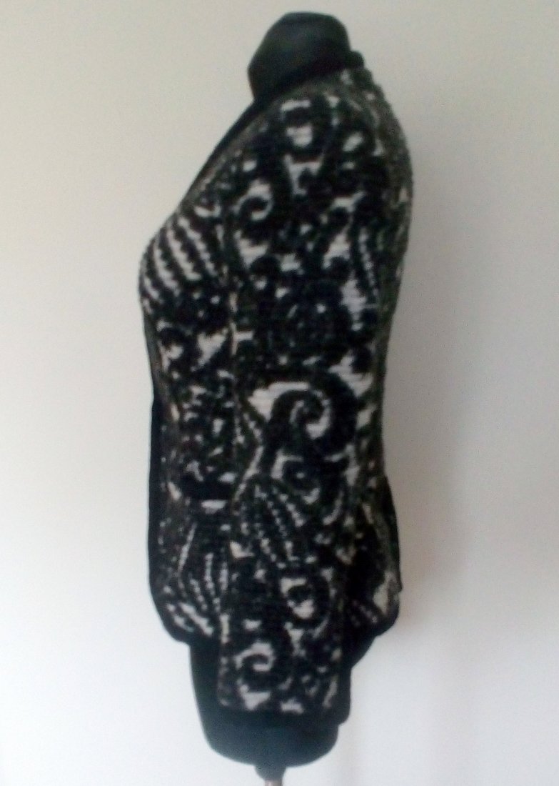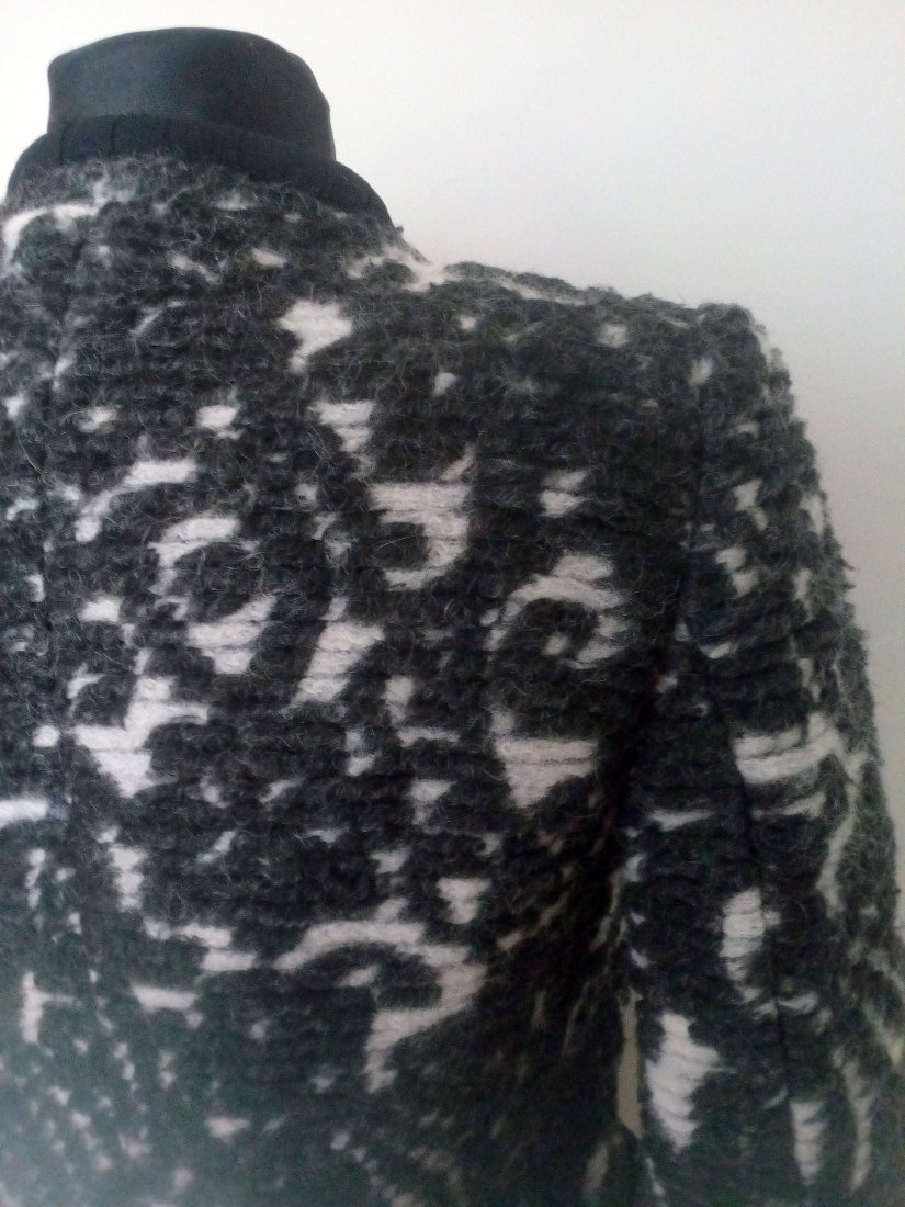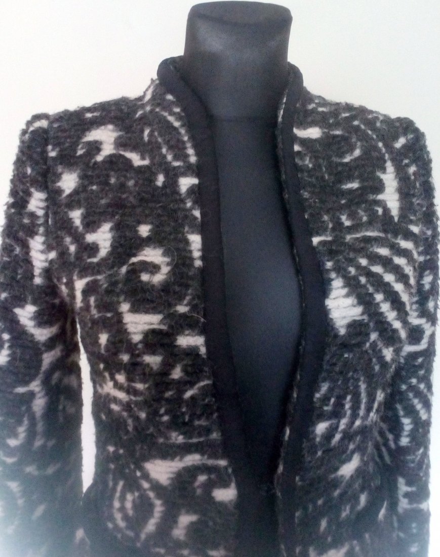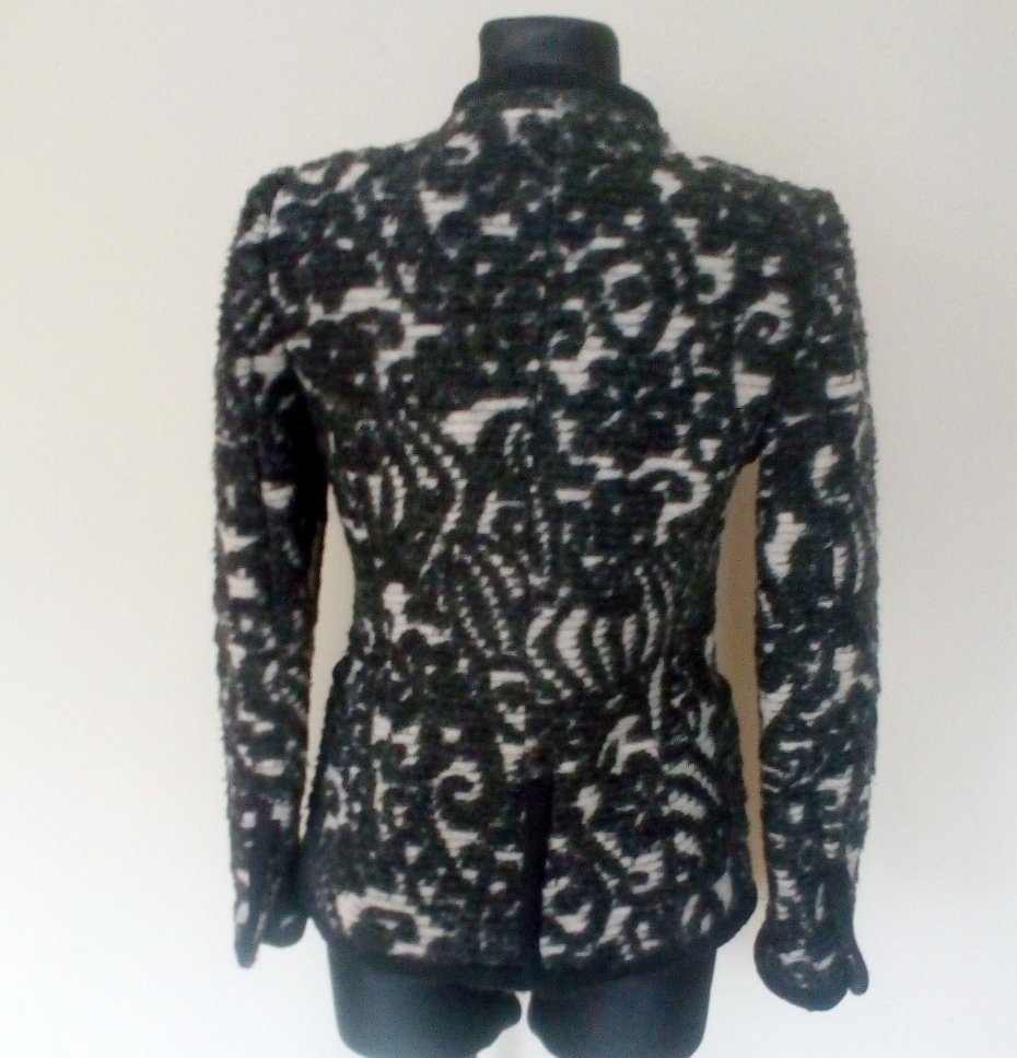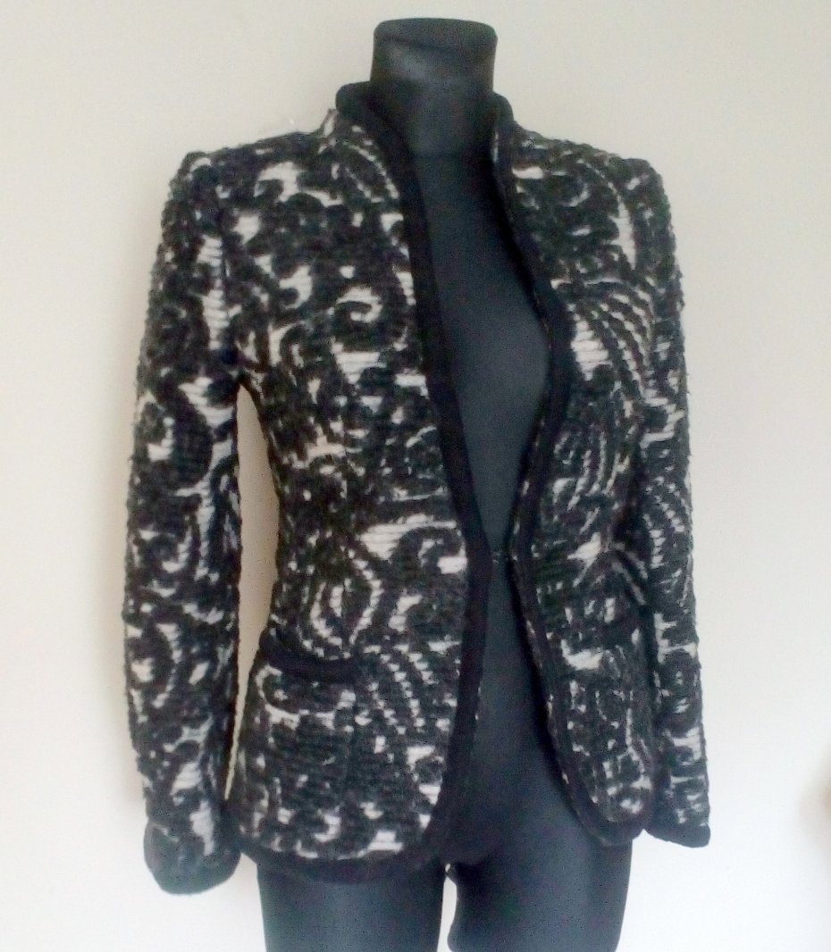 Czarno-biały żakiet z udziałem jedwabiu i wełny,  tkanina z wyrazną fakturą, mięsista, gruba, ale miękka i podatna, zapinany na jedną haftkę, u dołu przodu naszywane kieszenie, w tyle i na rękawach zakładane rozcięcie, po brzegach obszyty czarną lamówką, na ramionach poduszki, od środka czarna podszewka