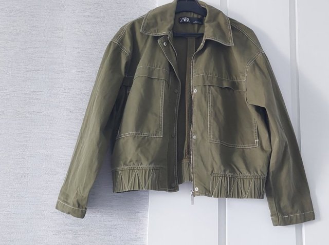 krótka kurtka marki zara, ze 100% sztywniejszej bawełny, bez podszewki. Stan bardzo dobry. kolor ciemnej zielonej oliwki. Rozmiar z metki xs ale to oversizowy fason, proszę sprawdzić wymiary.