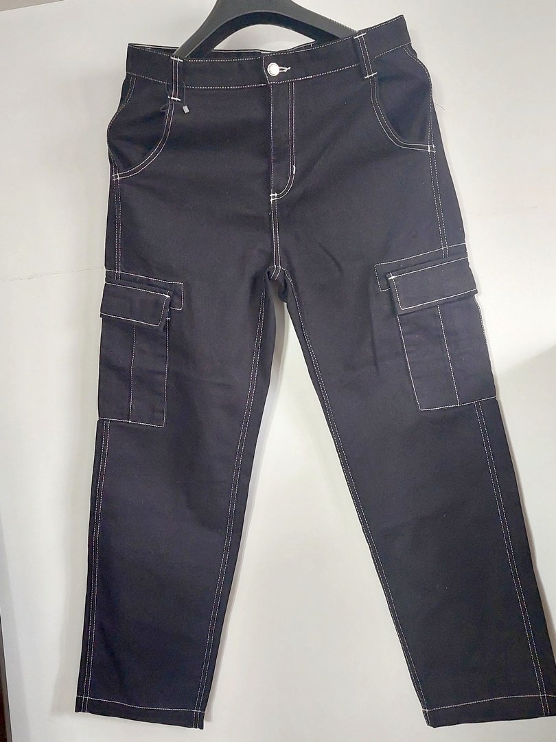 spodnie z grubszej bawełny z nakładanymi kieszeniami marki zara. materiał 100% bawełna. nogawka szeroka, zwężająca się, wysoki stan. kolor czarny, białe wykończenie. rozmiar z metki 42. stan prawdopodobnie nowe bez metki. proszę sprawdzić wymiary. Podaję wymiary mierzone na płasko: