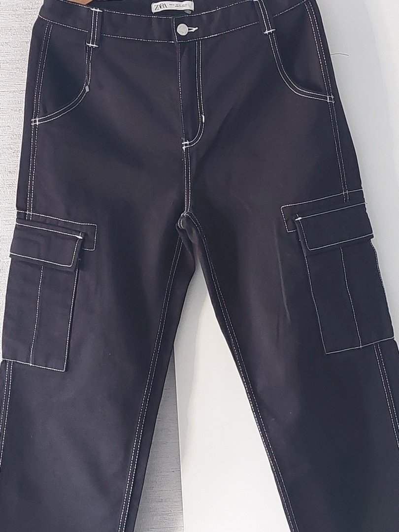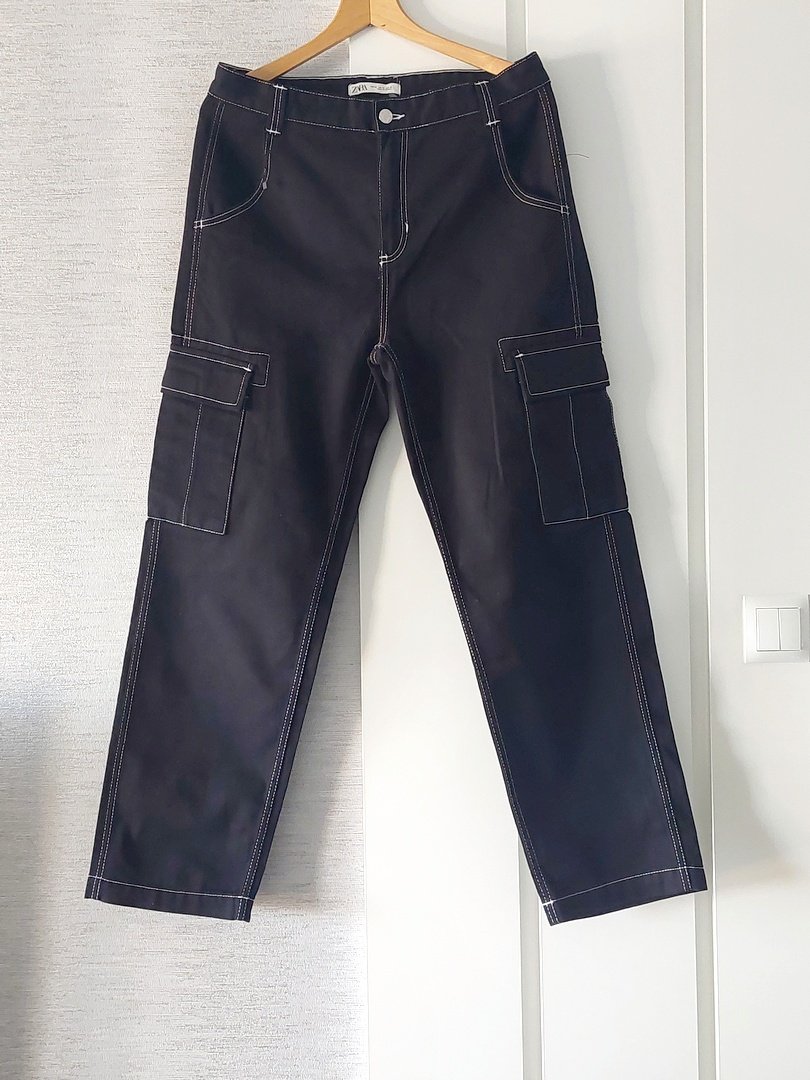 spodnie z grubszej bawełny z nakładanymi kieszeniami marki zara. materiał 100% bawełna. nogawka szeroka, zwężająca się, wysoki stan. kolor czarny, białe wykończenie. rozmiar z metki 42. stan prawdopodobnie nowe bez metki. proszę sprawdzić wymiary. Podaję wymiary mierzone na płasko: