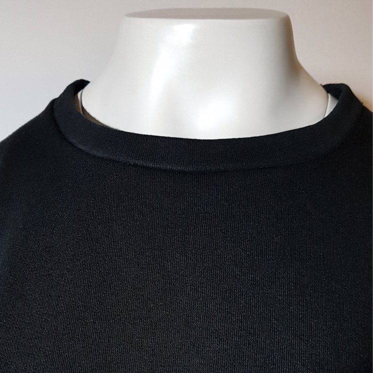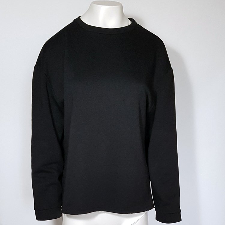 Luźna, komfortowa bluza damska. Linia ramion obniżona, rękawy proste, luźne zakończone prostym mankietem z dzianiny bazowej. dekolt okrągły, dolne brzegi zaokrąglone, niewykończone, tył nieco dłuższy.