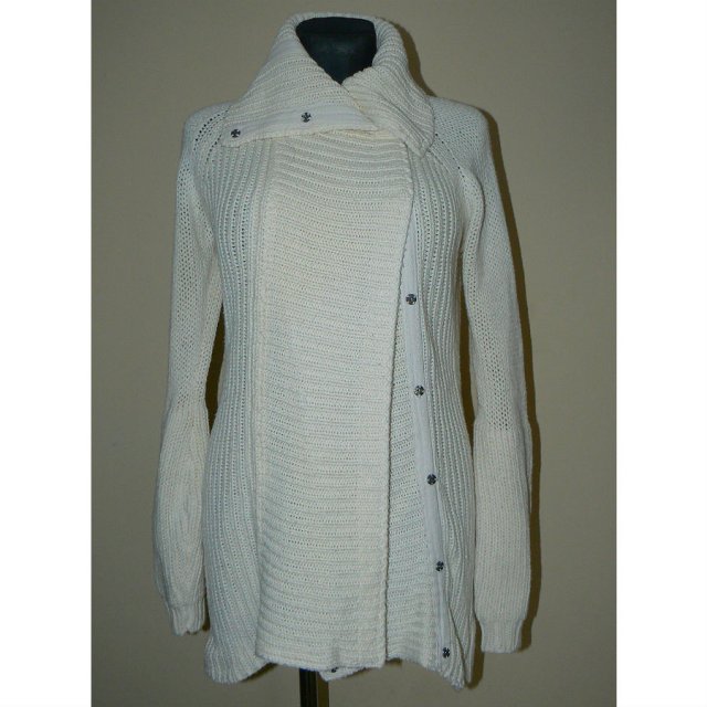 Dłuższy kardigan marki Zara, z grubej mięsistej dzianiny w kolorze kremowej bieli.
