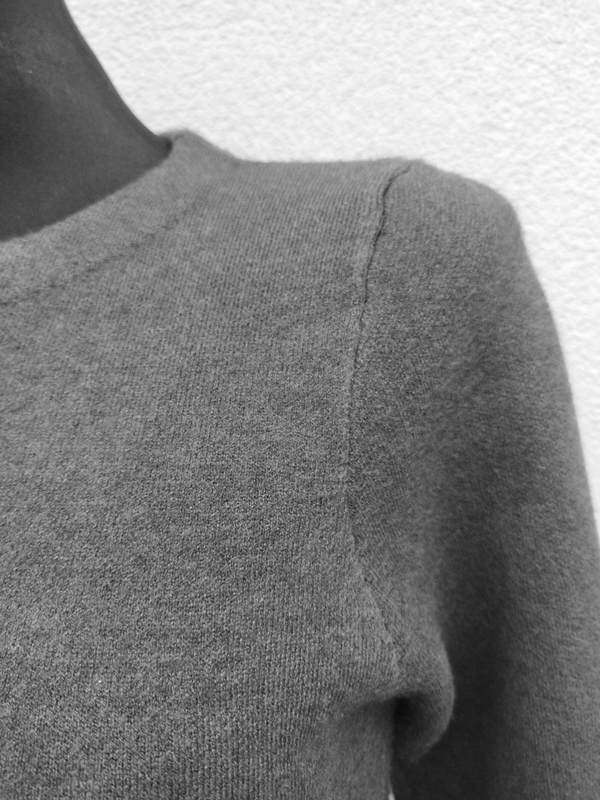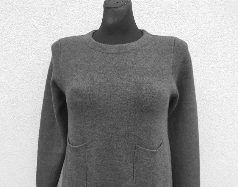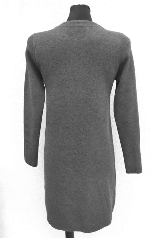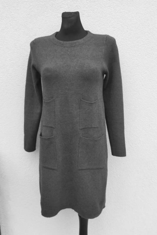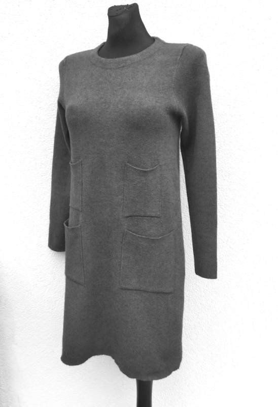 Dzianinowa sukienka z wiskozy, poliestru i nylonu w szarym kolorze. Minimalistyczny krój z czterema naszywanymi kieszeniami. Wciągana bez zamka. Miła , wygodna, dzianina masywniejsza dobrze trzyma fason