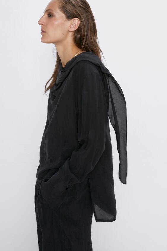 Czarna bluzka z długą szarfą zapinaną przy szyi na zatrzask, nowa z metką.