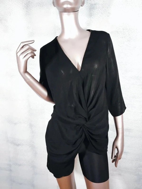 Dekolt wykończony biżuteryjną cienką taśmą, która subtelnie skrzy .