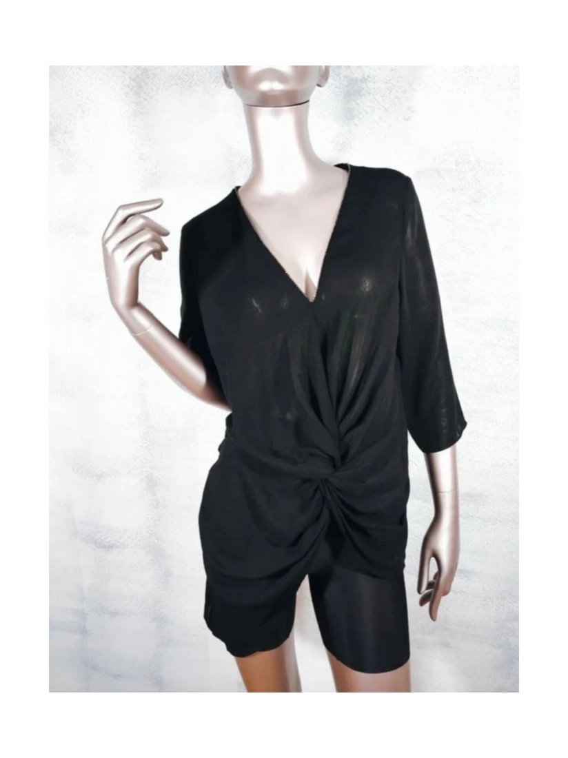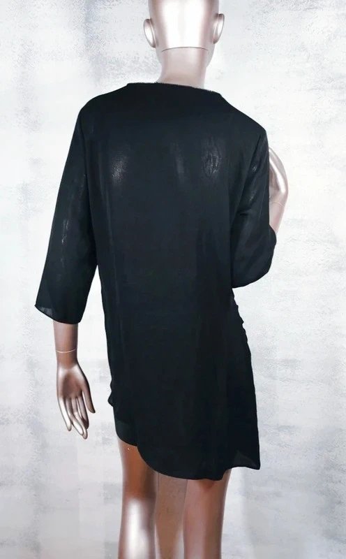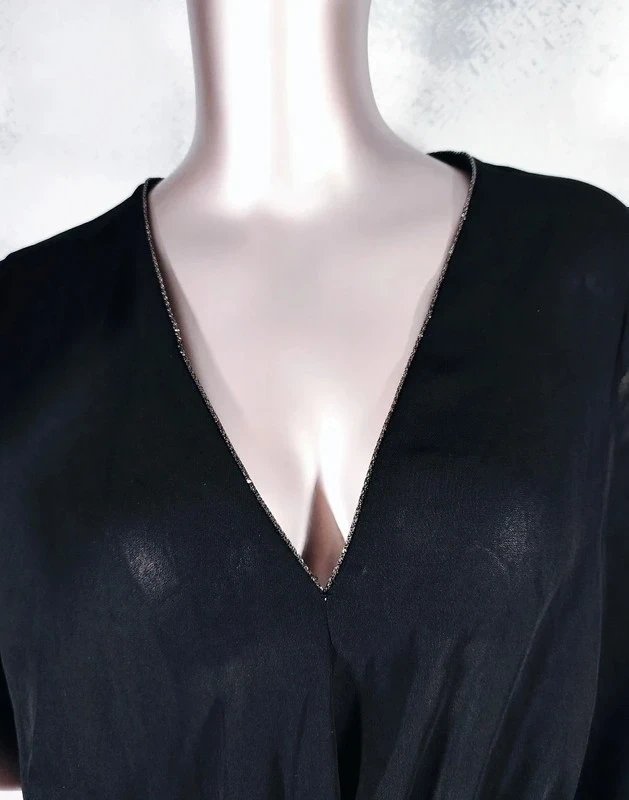 Dekolt wykończony biżuteryjną cienką taśmą, która subtelnie skrzy .