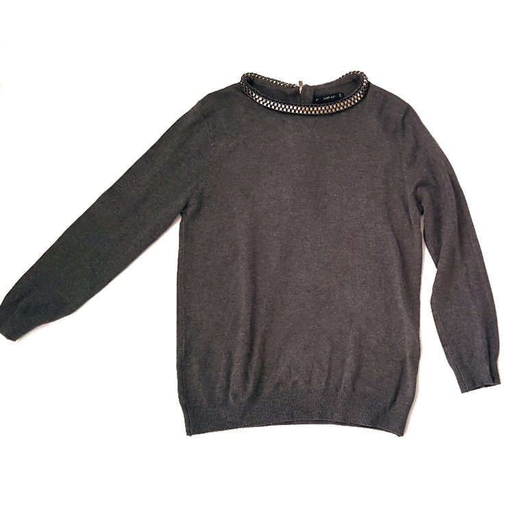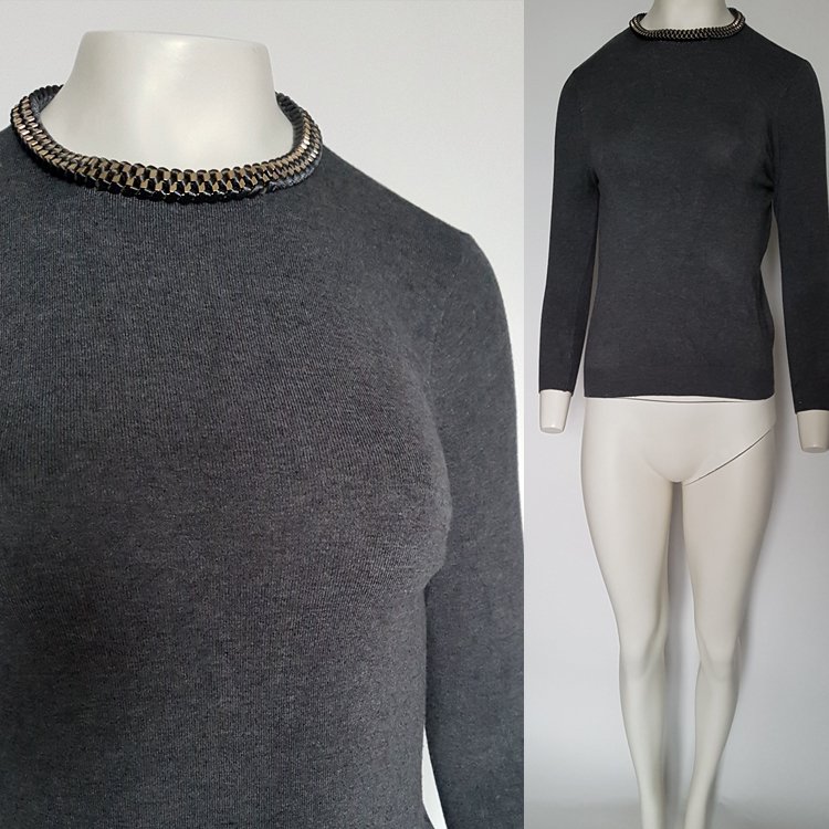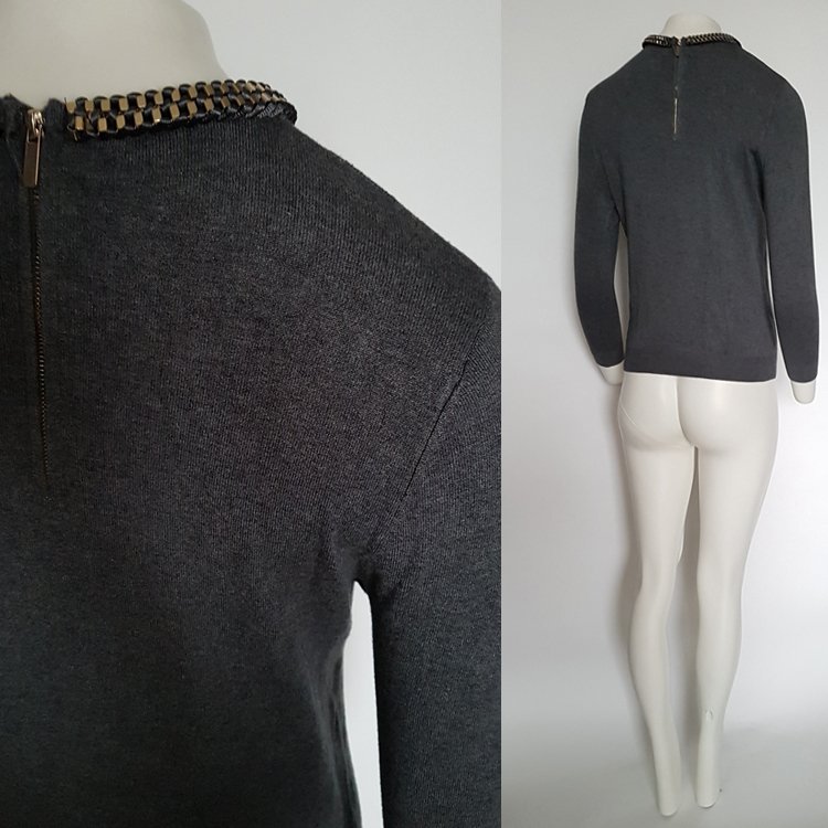 Dopasowany szary sweter zdobiony przy szyi łańcuchem. Rękawy długie dopasowane. Z tyłu zapinany na metalowy zamek. Dzianina miękka, bardzo przyjemna.