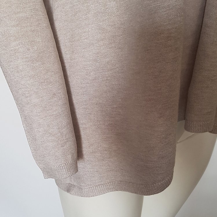 Sweter narzutka z luźnym kołnierzem szalowym, bez zapięcia. Rękawy długie, dopasowane, wykończone podobnie jak dolny brzeg wąskim ściągaczem.