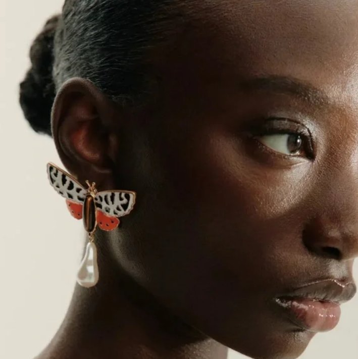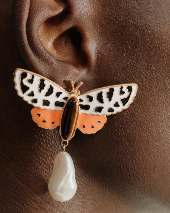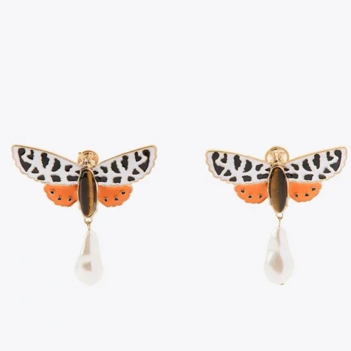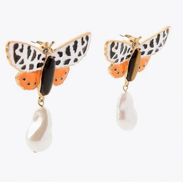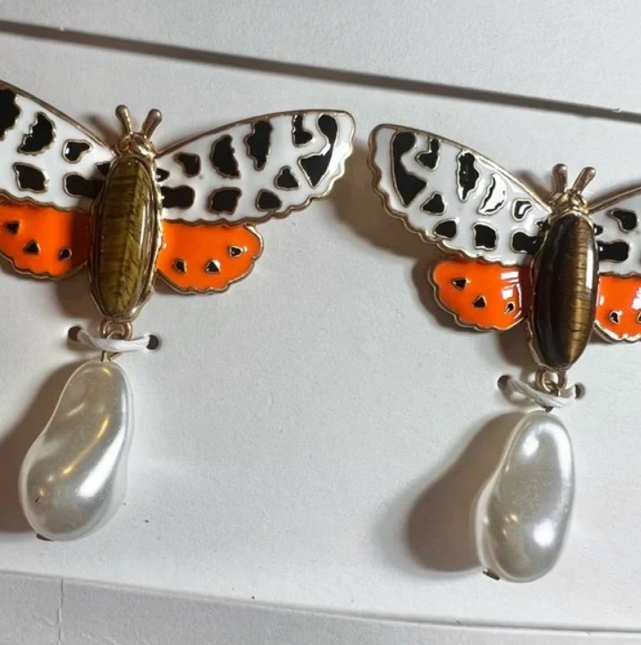 Kolczyki w kształcie motyli z kamykami imitującymi perły. Nowe, w oryginalnym opakowaniu.