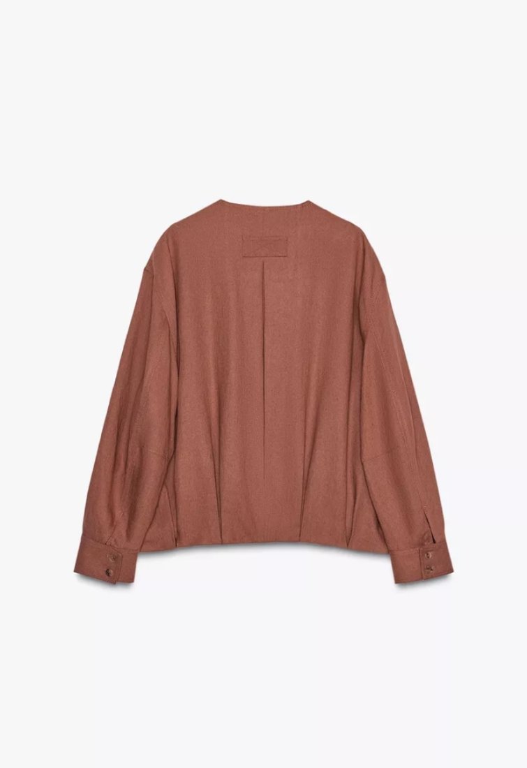 Ceglana bomberka wykonana z mieszanki Inu i wiskozy. Okrągły dekolt i długie rękawy zakończone mankietami. Ozdobne plisy. Zapięcie na guziki z przodu.