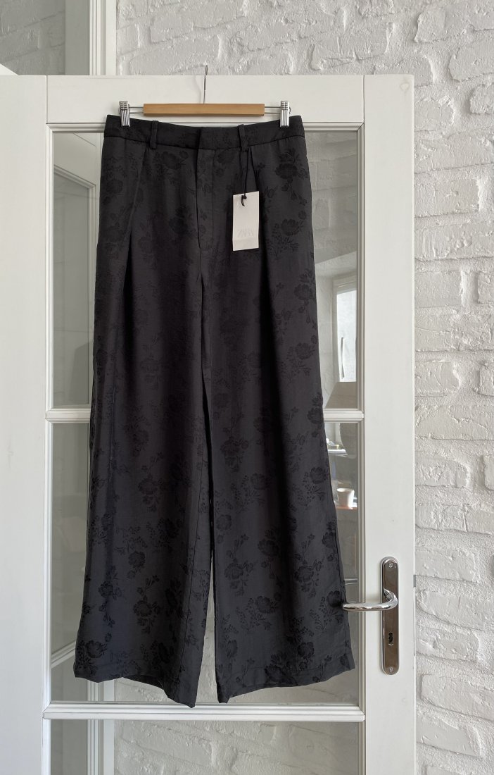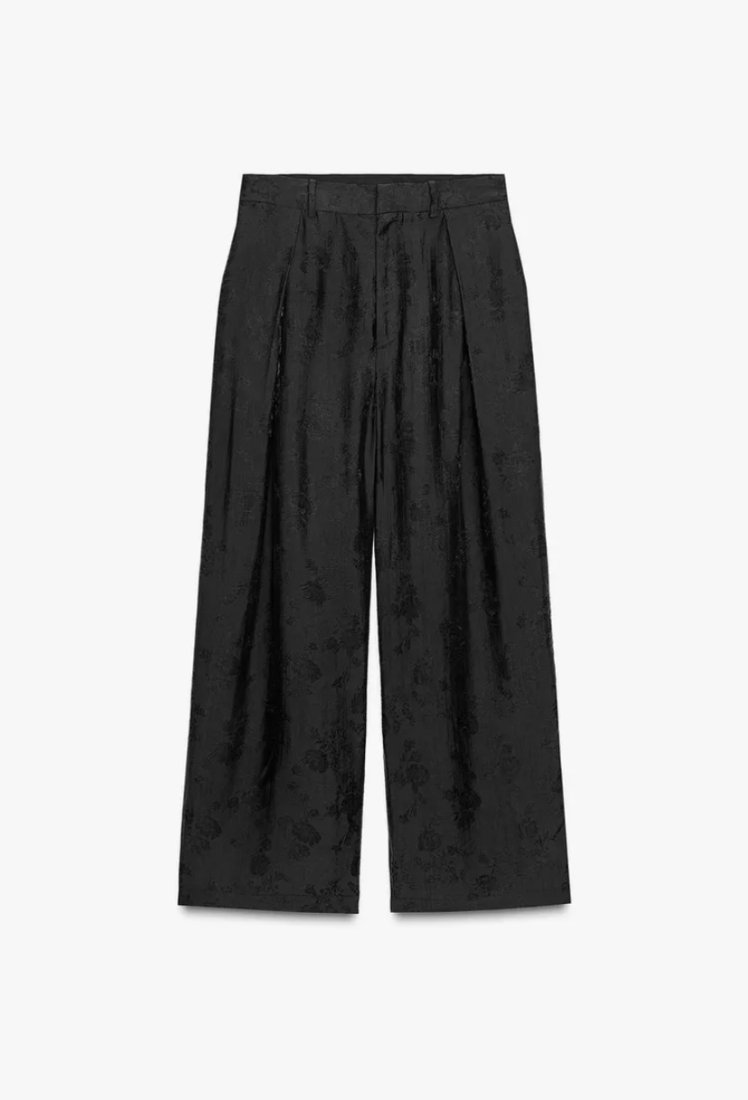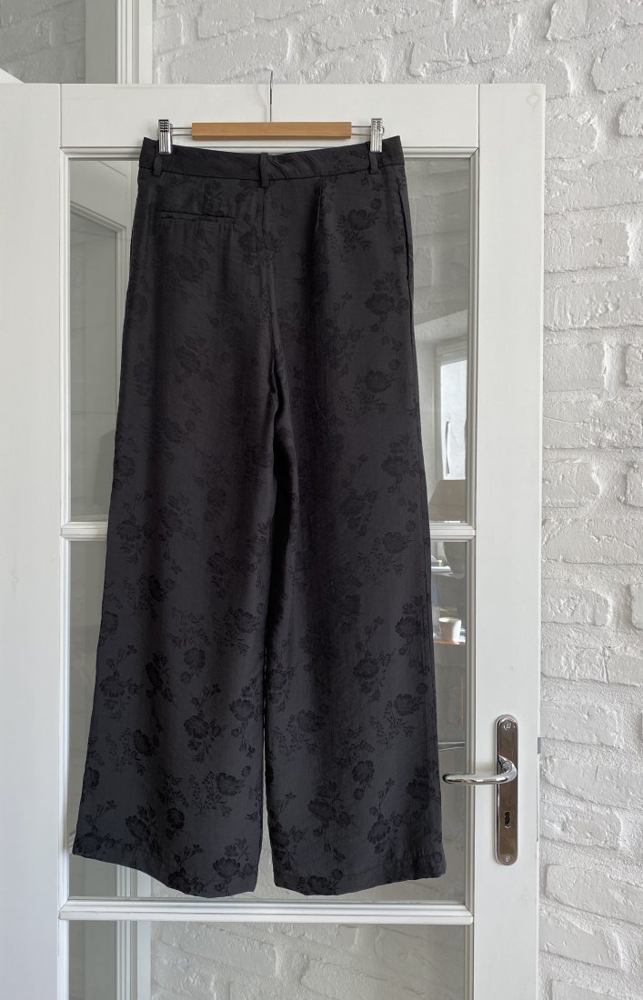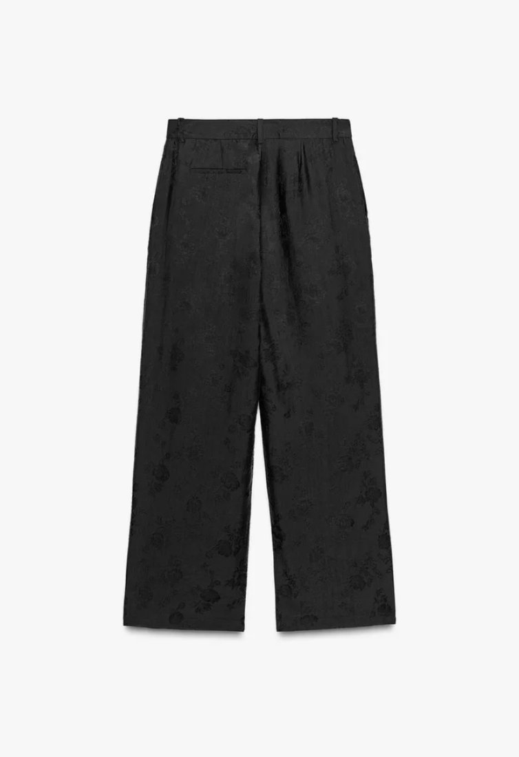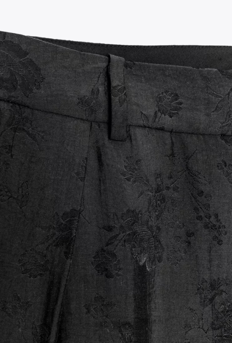Czarne żakardowe spodnie z lyocellu. Szlufki na pasek. Zaszewki z przodu. Kwiatowy żakardowy wzór. Zapięcie z przodu na zamek błyskawiczny, guzik i metalową haftkę.