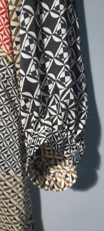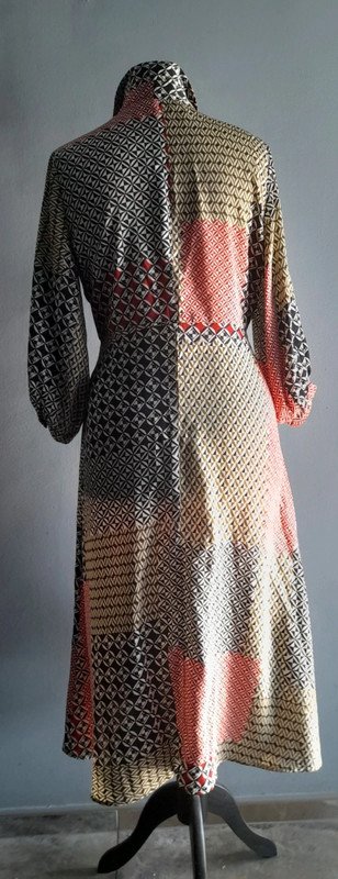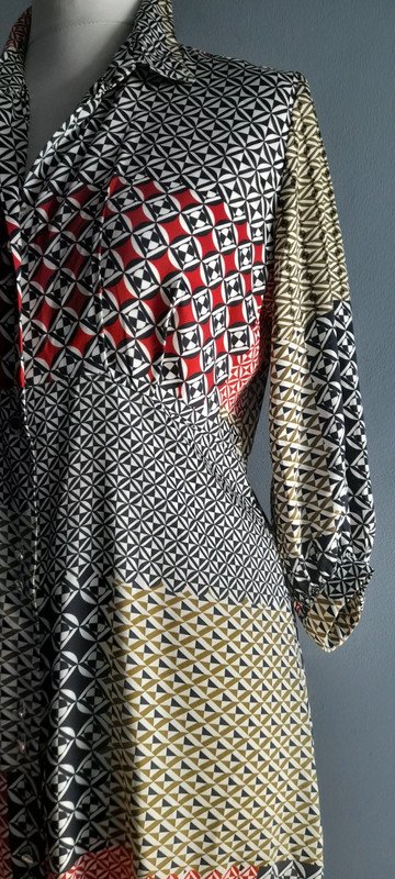 Sukienka ze śliskiego materiału prawdopodobnie wiskoza, brak metki ze składem, stan idealny, jeden guzik do wzmocnienia długość 120, szerokość pod pachami 54x2 max, pas 52x2 max, w realu kolory żywsze