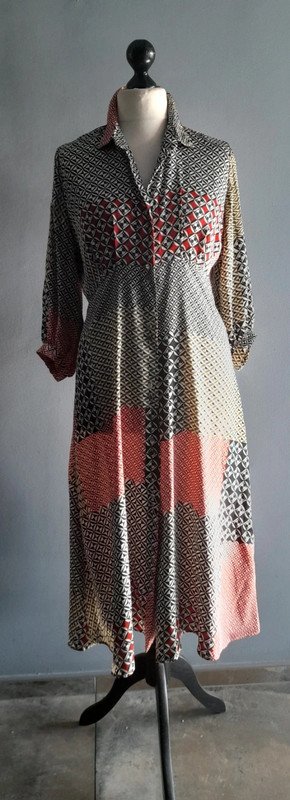 Sukienka ze śliskiego materiału prawdopodobnie wiskoza, brak metki ze składem, stan idealny, jeden guzik do wzmocnienia długość 120, szerokość pod pachami 54x2 max, pas 52x2 max, w realu kolory żywsze