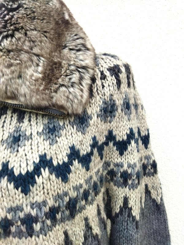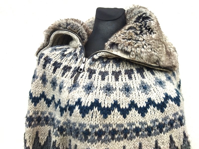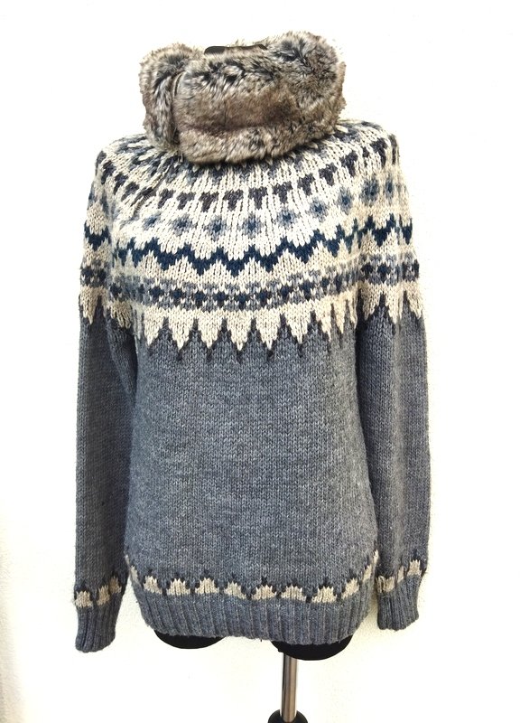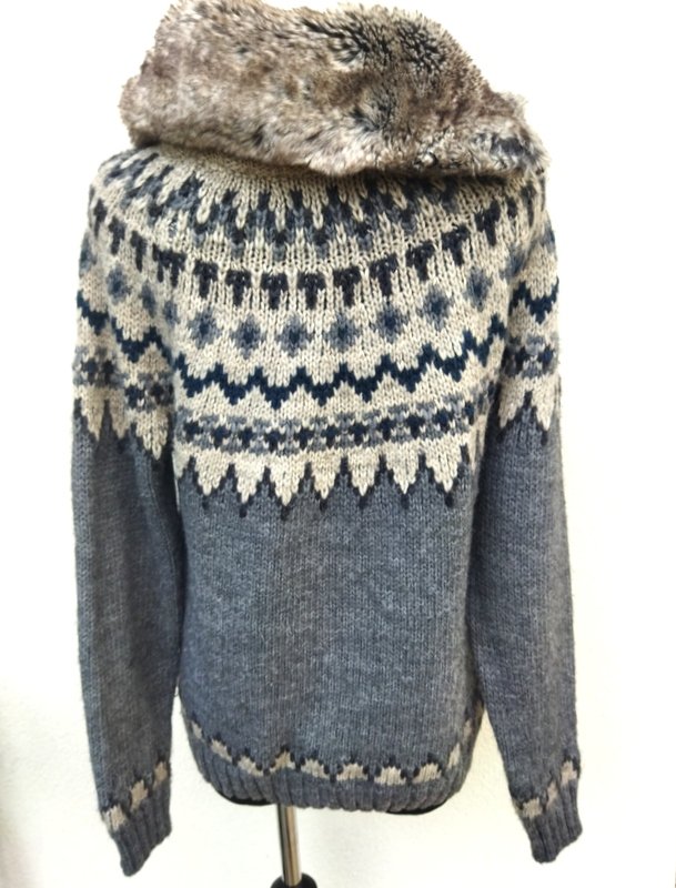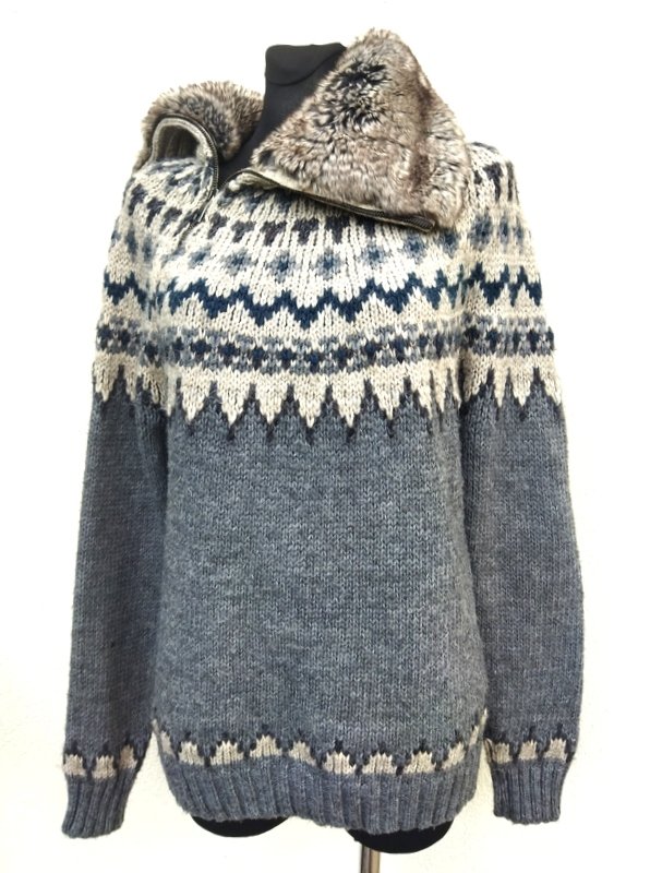 Ciepły sweter z grubszej akrylowe włóczki z domieszką poliestru , w kolorystyce odcieni szarości. Z kołnierzem ze sztucznego futerka z asymetrycznym zapięciem na zamek. Wykończony ściągaczami