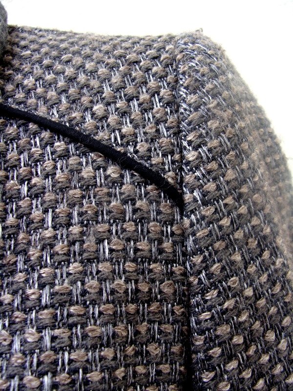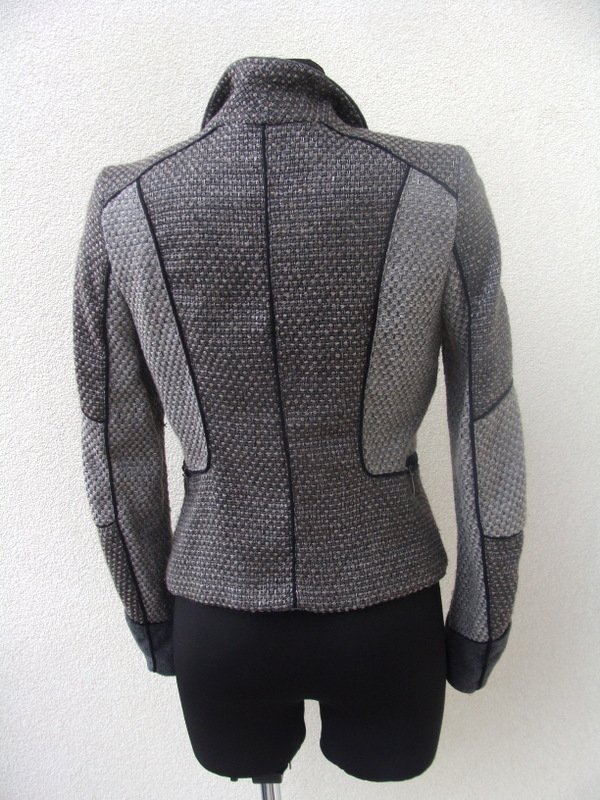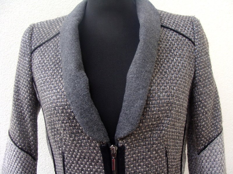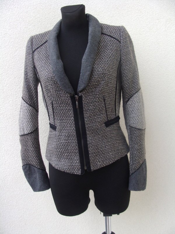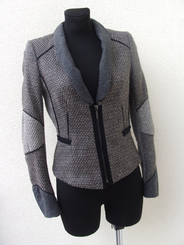 Zgrabna marynarka z grubszych tkanin z wyrazistą fakturą przeplatanki w kilku odcieniach szarości oraz cappuccino .Wszystkie szwy łączeniowe podkreślone czarną lamówką. Dekolt z wąskim smokingowym kołnierzem, u dołu dwie wpuszczane kieszenie. Zapinana z przodu na zamek. Całość na podszewce.