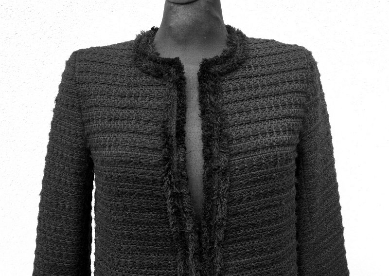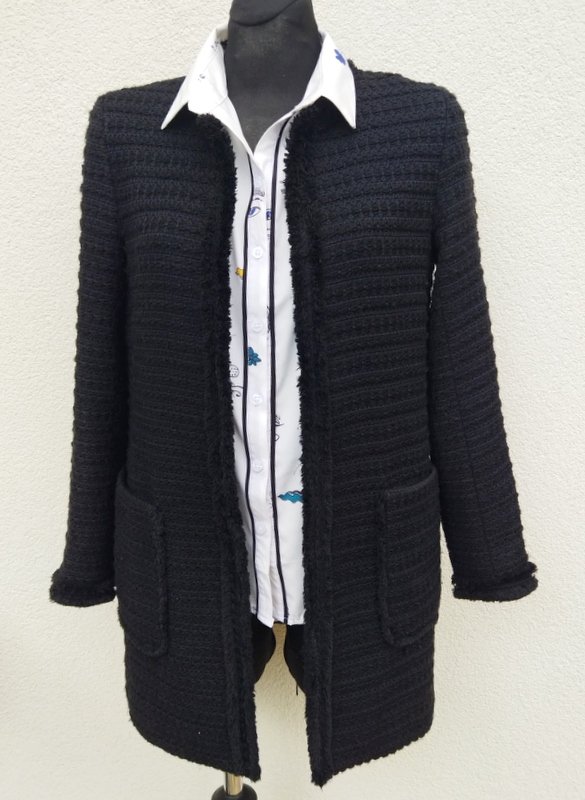Dłuższa ciepła marynarka z grubszej tkaniny z fakturą w czarnym kolorze wykończona krótkim frędzelkami wyciąganymi z tkaniny. Bez kołnierza , z dwiema naszywanymi kieszeniami. Zapinana na haftki. Zastąpi wiosenny płaszczyk lub kurtkę. całość na podszewce