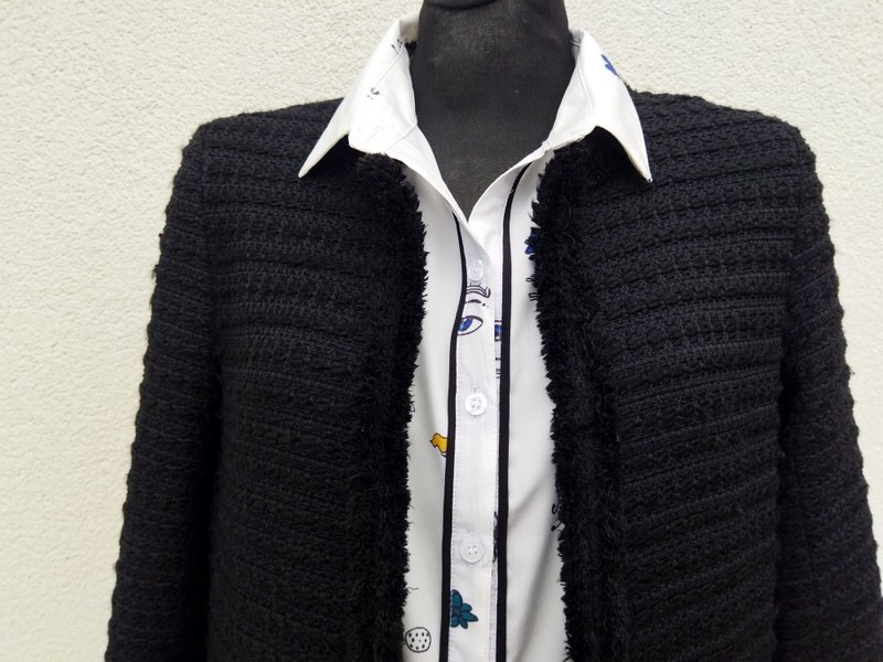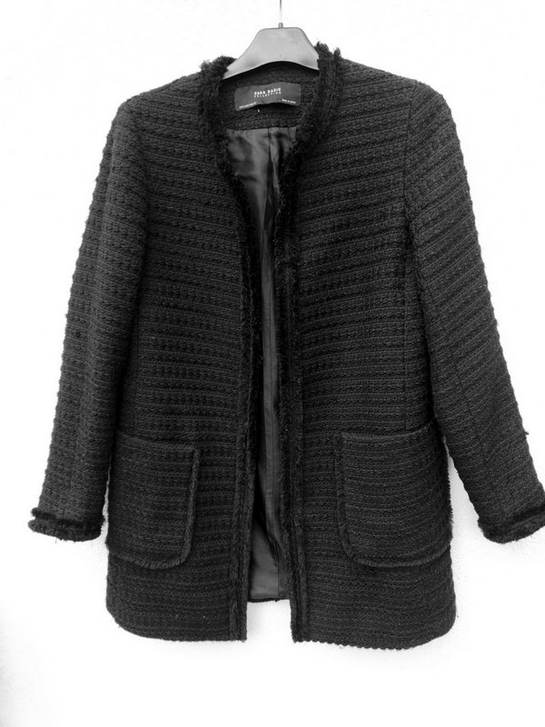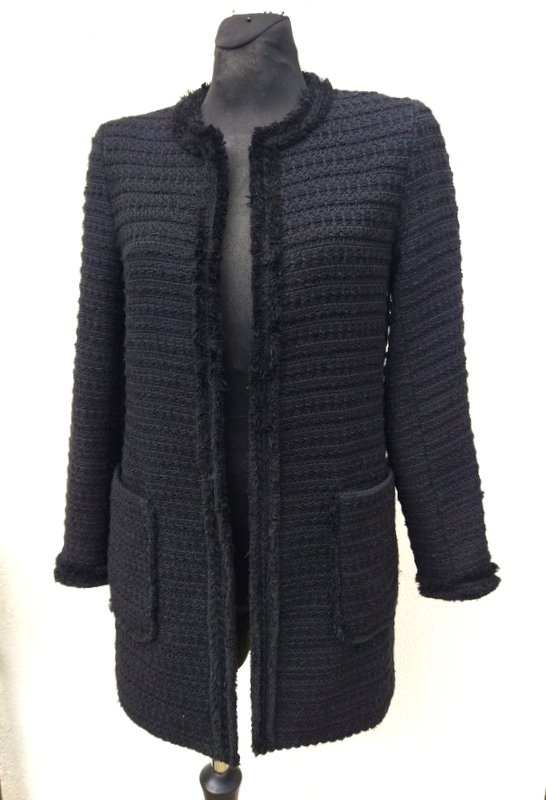 Dłuższa ciepła marynarka z grubszej tkaniny z fakturą w czarnym kolorze wykończona krótkim frędzelkami wyciąganymi z tkaniny. Bez kołnierza , z dwiema naszywanymi kieszeniami. Zapinana na haftki. Zastąpi wiosenny płaszczyk lub kurtkę. całość na podszewce