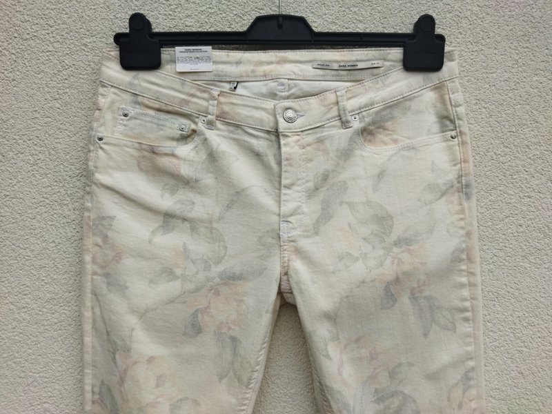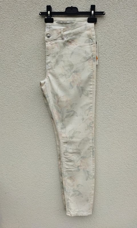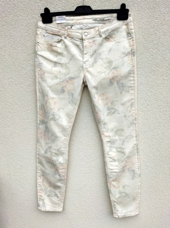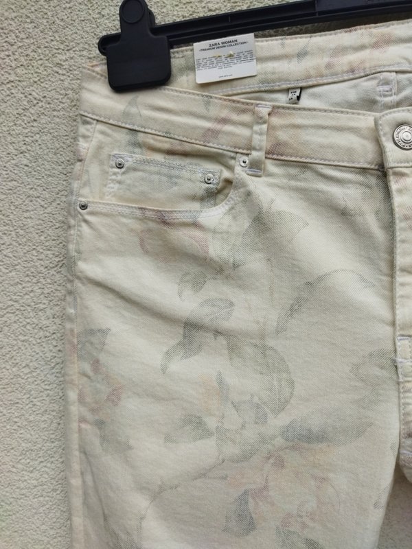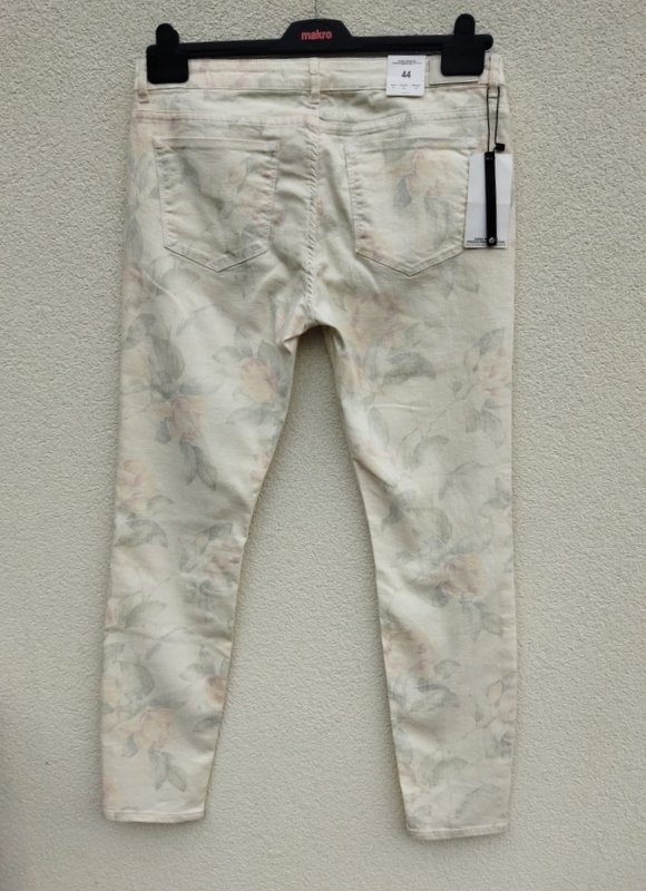 Piękne eleganckie spodnie w kolorze ecru z delikatnym zarysem wzoru kwiatowego w pastelowych kolorach. Klasyczne 5 kieszeni, nogawki lekko zwężane do dołu , zapinane na zamek i napowy guzik.