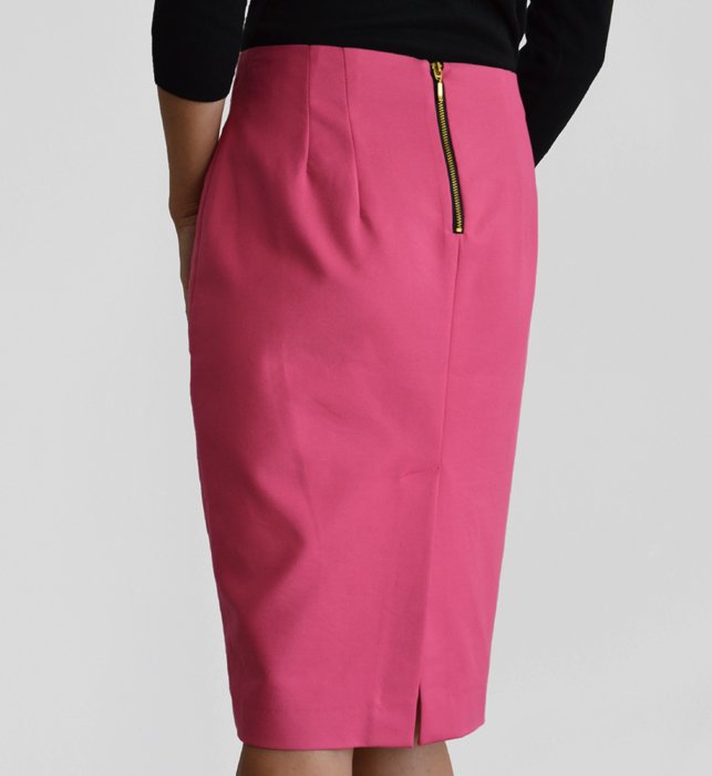 Różowa, ołówkowa spódnica marki Zara. ZwZ tyłu złoty zip.
