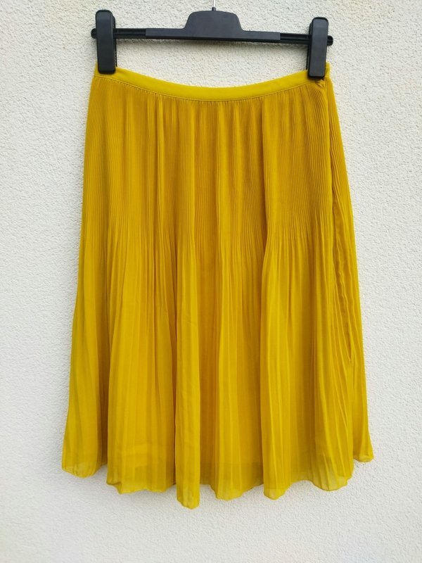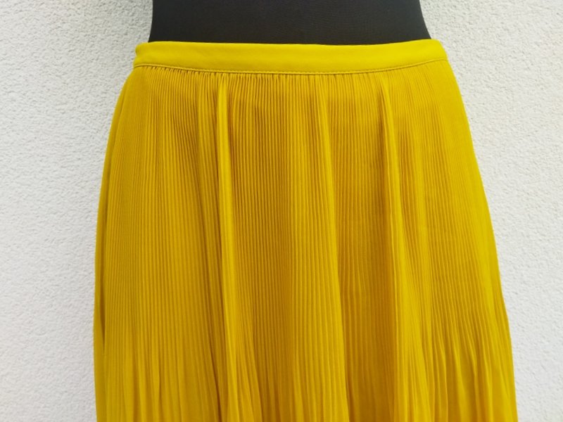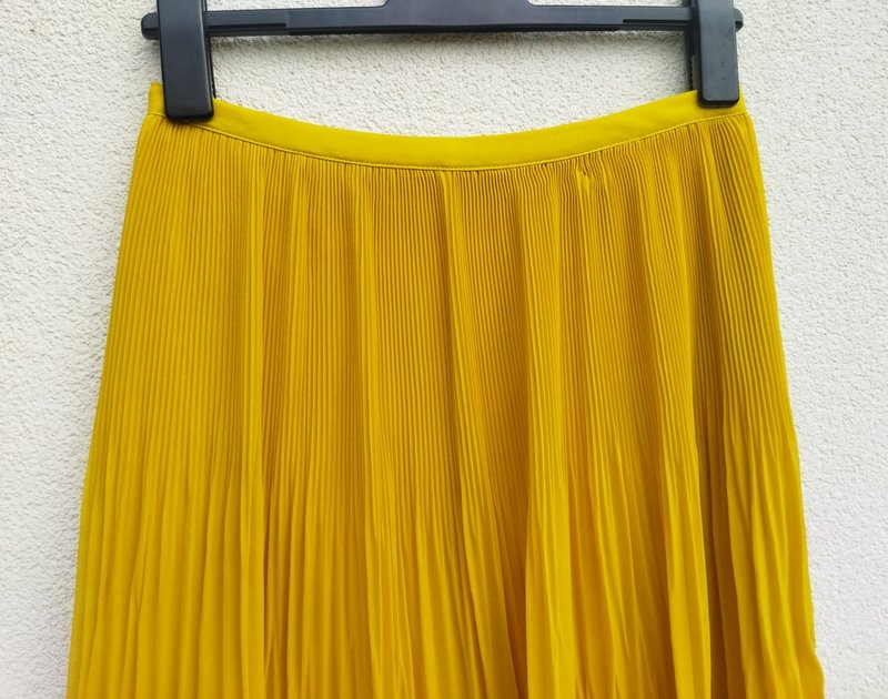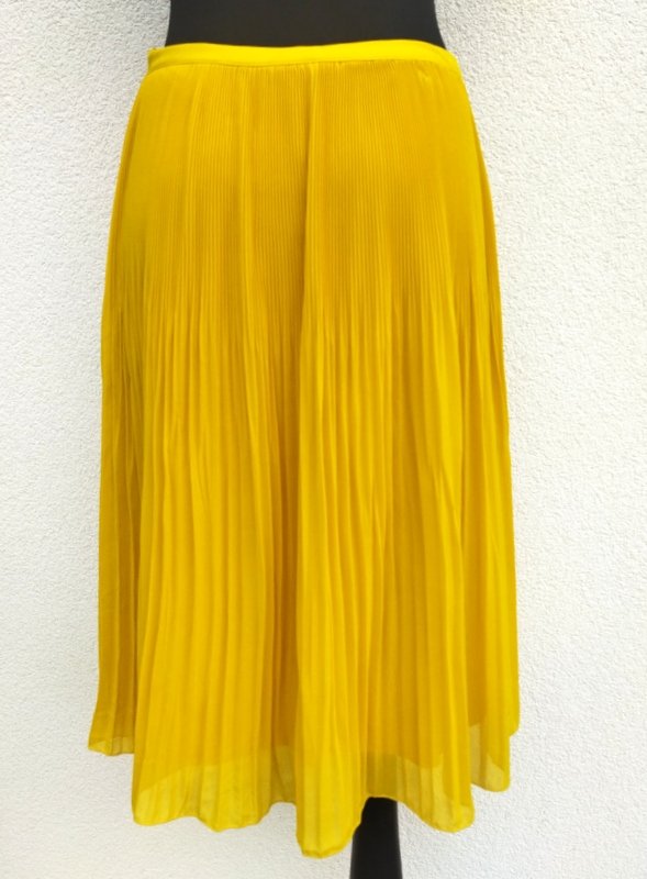 Świetna  spódniczka z plisowanej żorżey poliestrowej w kolorze nasyconej żółci . Zapinana z boku na zamek . Na rozciągliwej podszewce  w tym samym kolorze.