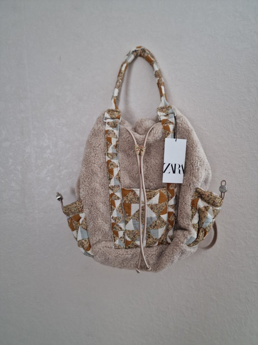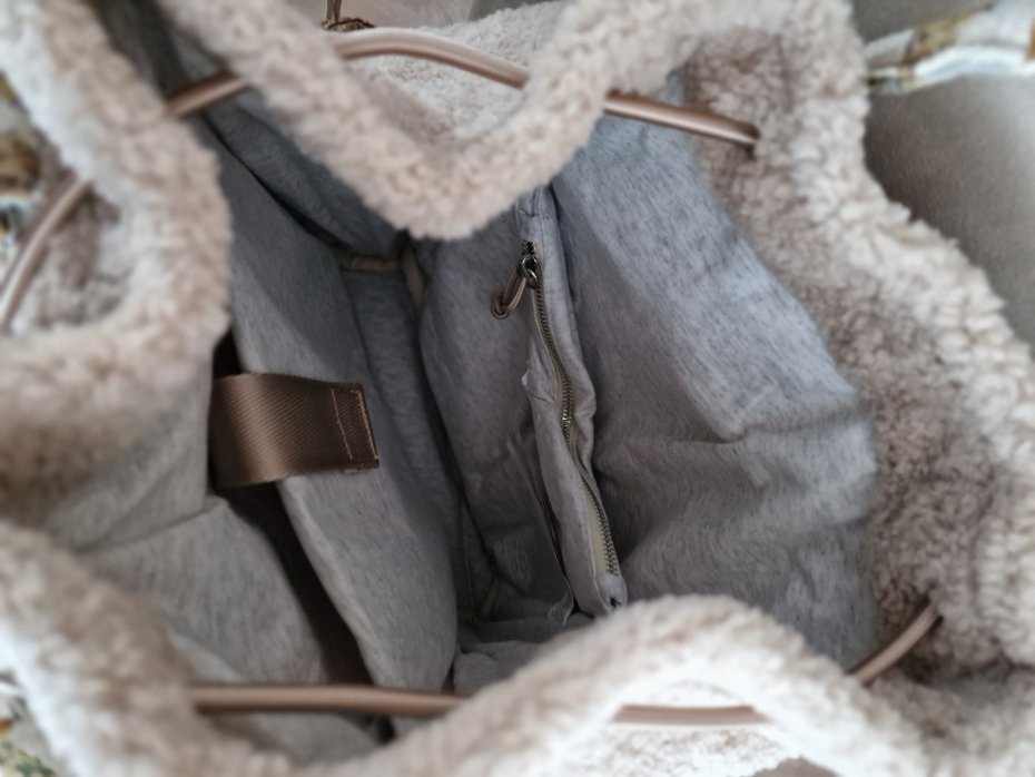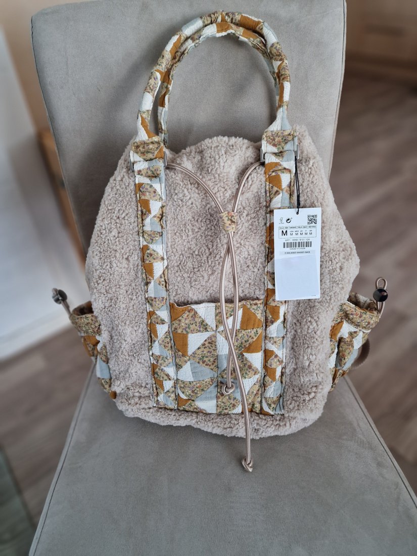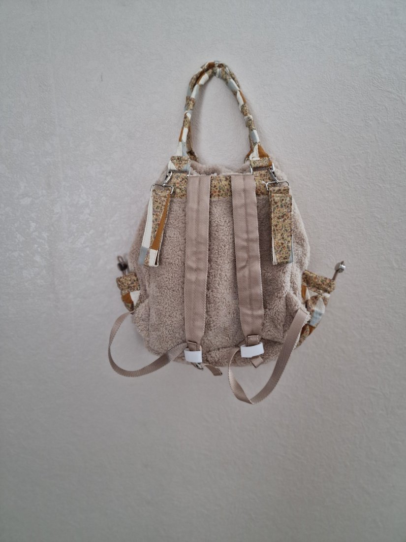 Pojemny plecak z regulowanymi ramiączkami, można nosić na ramieniu jak torebkę. Posiada również dodatkowe paski mocujące do roweru lub wózka. Nowy, z metką. (model unikatowy, niedostępny już w regularnej sprzedaży).