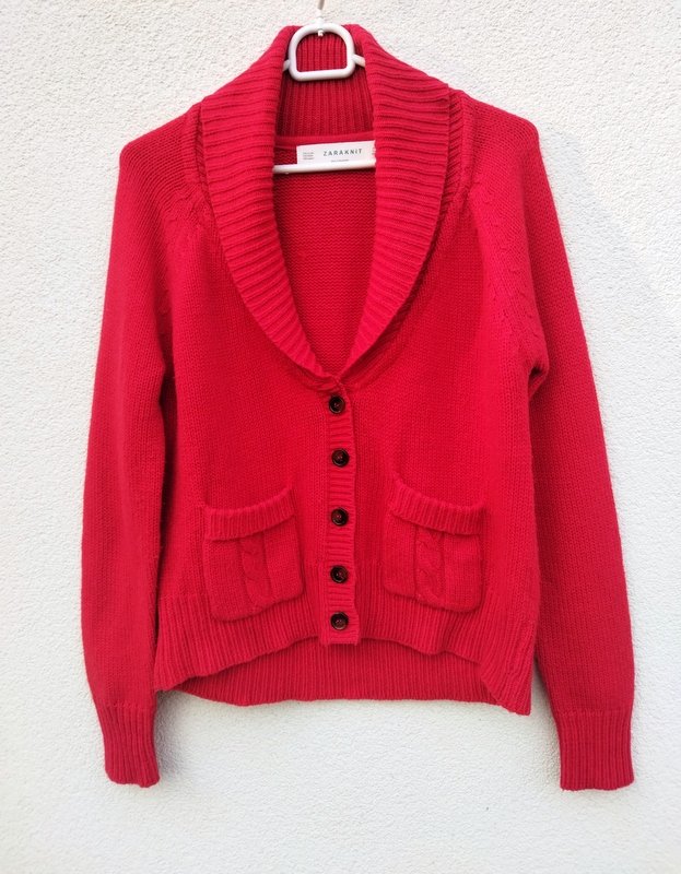 Miły mięciutki krótki akrylowy sweter z domieszka angory i nylonu w kolorze makowej czerwieni. Z szalowym kołnierzem, z raglanowymi rękawami, z dwiema naszywanymi kieszeniami. Zapinany na guziki. wykończony ściagaczami