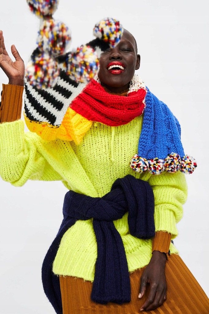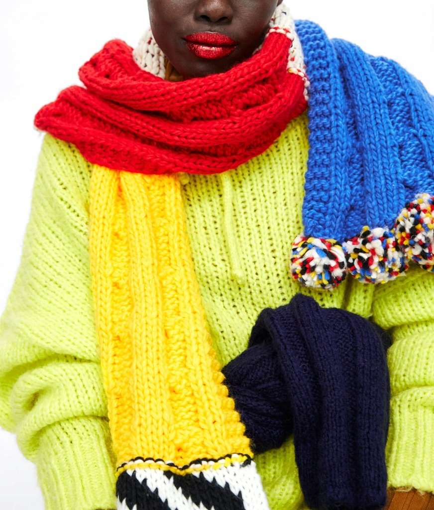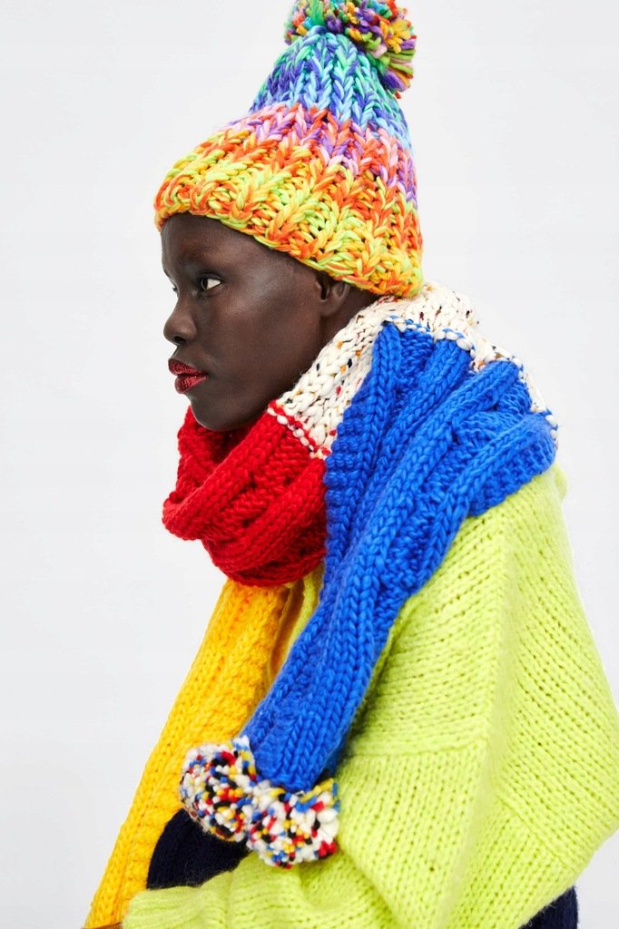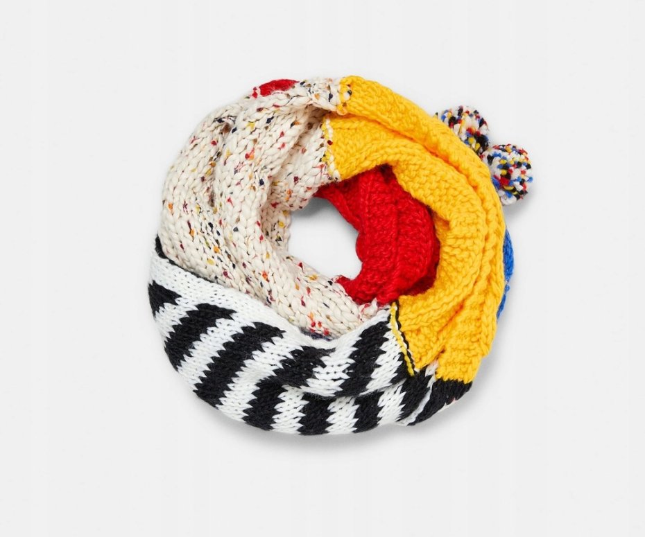 Niezwykle efektowny, długi szalik z łączonych dzianin. Ozdobne pompony. Nowy, z metkami.