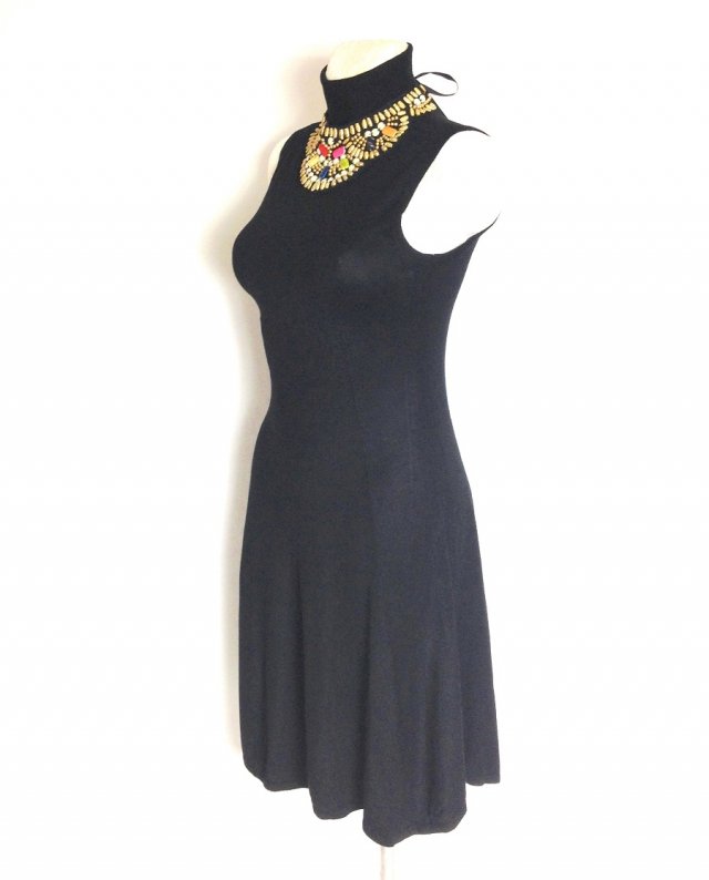 Czarna dzianinowa sukienka marki Zara z golfem wykonana z elastycznej dzianiny, w pasie dopasowana, następnie stopniowo poszerzana.