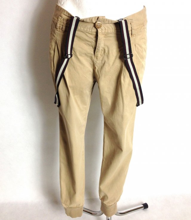 Beżowe spodnie marki Zaraz z szelkami (szelki odpinane ) z przodu zasuwane na suwak i zapinane na guzik, po bokach kieszenie, delikatnie obniżony krok, nogawki wykończone ściągaczem.