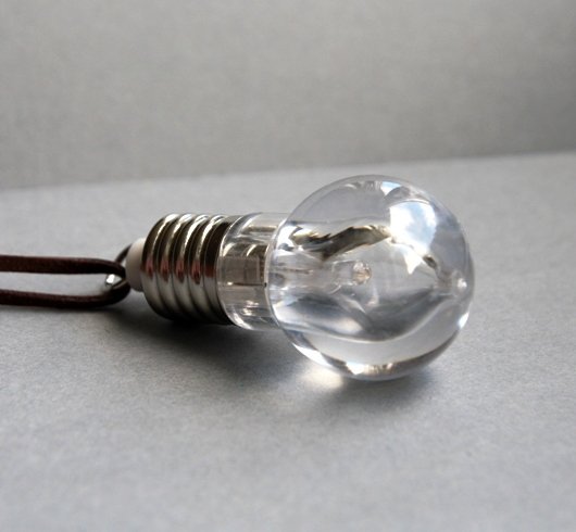 Pomysłowy wisiorek o kształcie żarówki, wykonany z mocnego plastiku. Zawieszony na sznurku imitującym rzemień. Polecam:)
