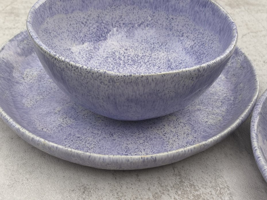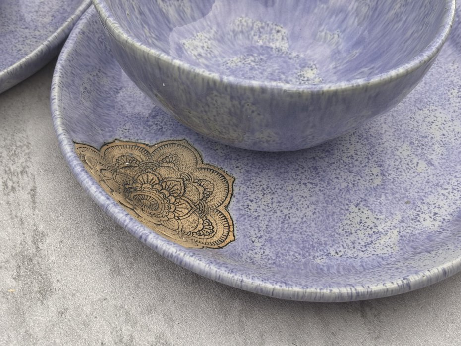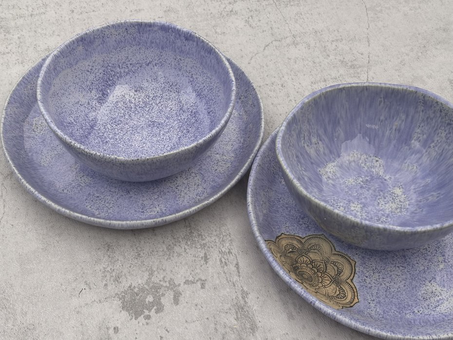 To wyjątkowy zestaw obiadowy wykonany ręcznie z niezwykłą starannością, pokryty głębokim błękitnym kolorem z przebarwieniami. Powierzchnia szkliwiona nietoksyczną glazurą która odbija pięknie światło. Ten zestaw doskonale sprawdzi się jako obiadowy lub do przekąsek. Wypalony dwukrotnie, ostatni wypał wykonany w temperaturze powyżej 1200 stopni co czyni go niezwykle trwałym oraz odpornym. Naczynia z powodzeniem można myć w zmywarce.