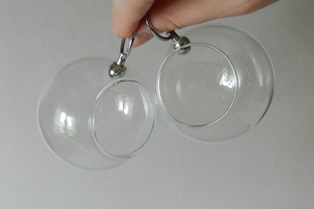 Dwie szklane ozdobne kulki z otworkami i niklowanymi kółkami do zawieszenia. Można puścić wodzę fantazji... i wykorzystać je wielorako ;)