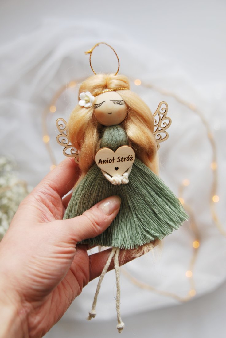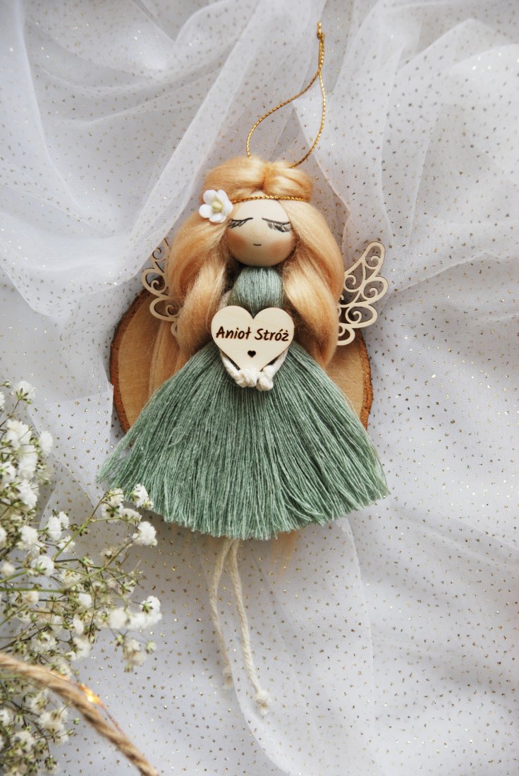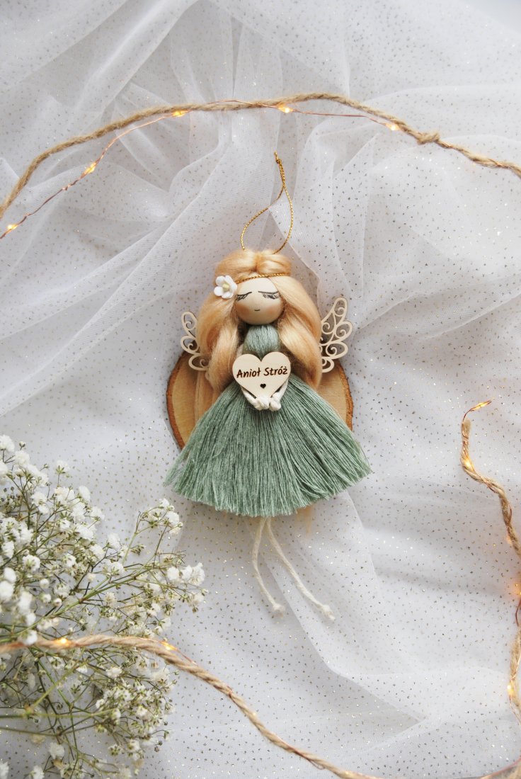 Wykonany z dbałością o każdy detal. Sukienka jest w pięknym, szałwiowym kolorze, a włosy blond. Aniołek trzyma serduszko z napisem "Anioł Stróż", symbolizując opiekę i dobro, jakie niesie osobie obdarowanej.