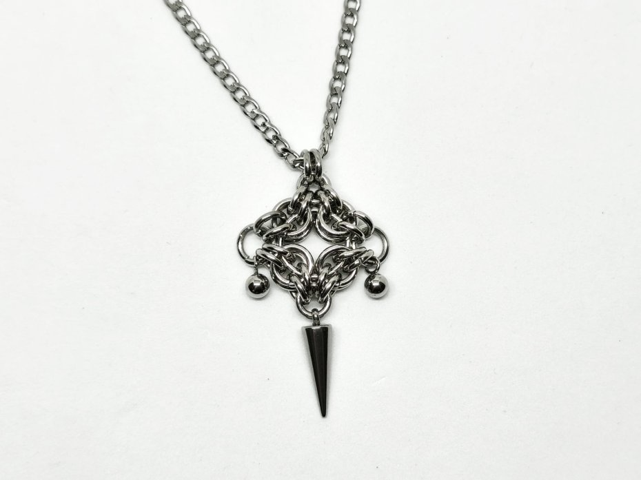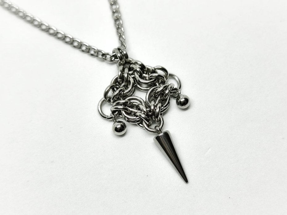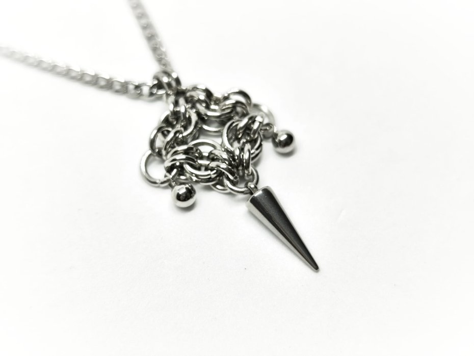 Zawieszka chainmaille ze stali chirurgicznej 316L – gęsty splot, centralny ostry kolecze stali nierdzewnej, błyszczące kuleczk. Całość wisi na długim łańcuszku, wygląda jak fragment mrocznej zbroi, artefakt z fantasy albo symbol ciemnej mocy.