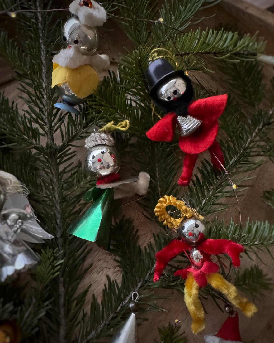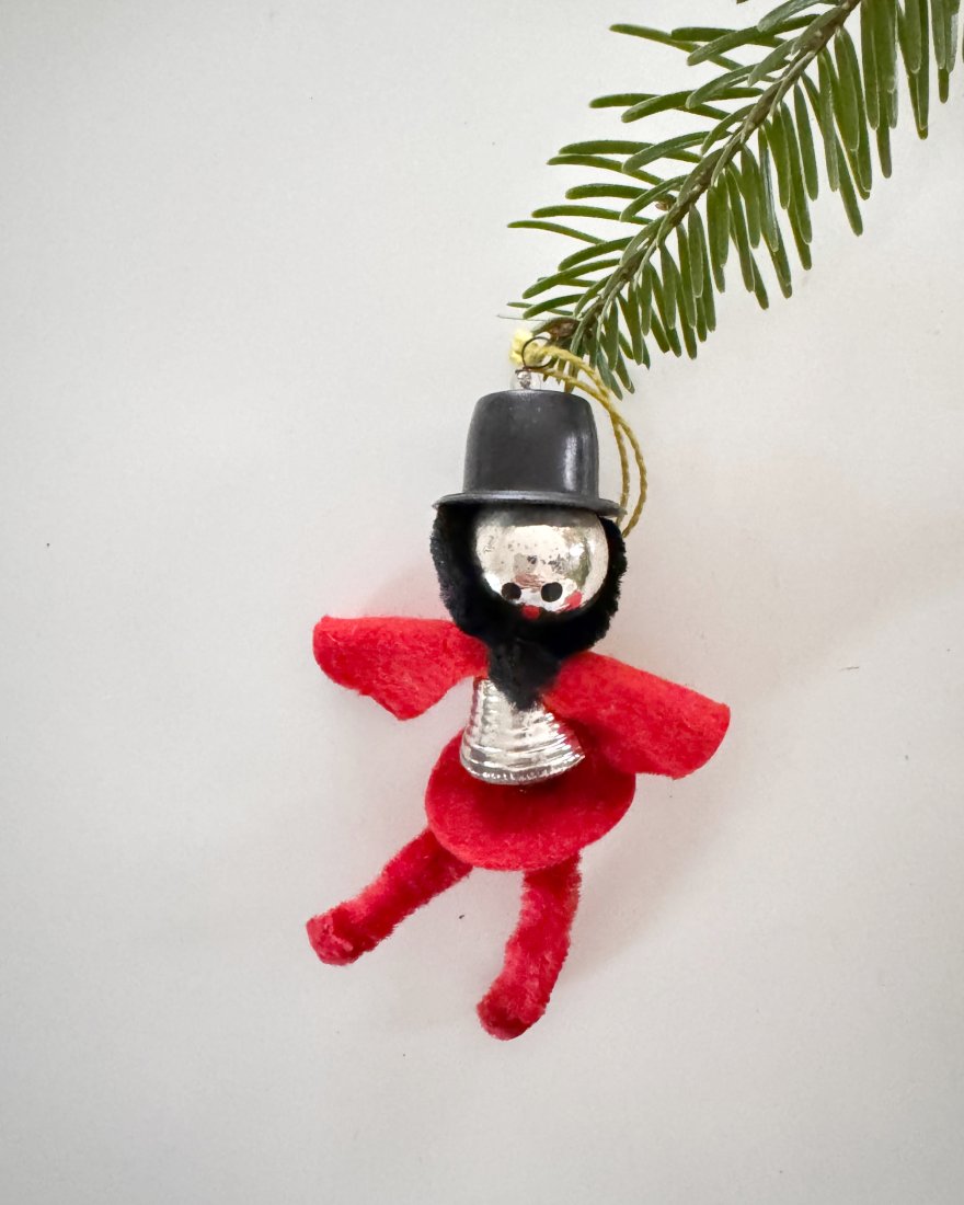Ozdoba choinkowa w kształcie ludzika wykonana ręcznie na bazie koralików, bombek, drucików ozdobnych i innych detali oraz ręcznie malowana.