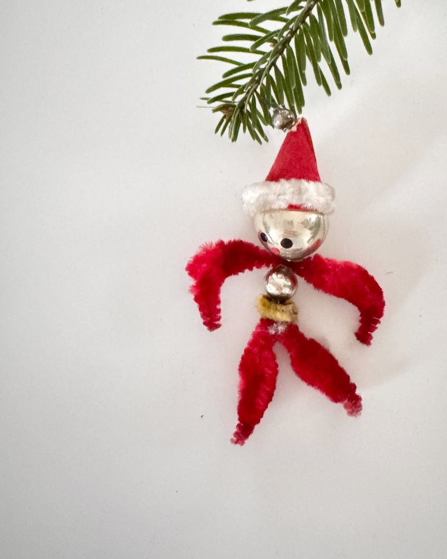 Ozdoba choinkowa w kształcie ludzika wykonana ręcznie na bazie koralików, bombek, drucików ozdobnych i innych detali oraz ręcznie malowana.