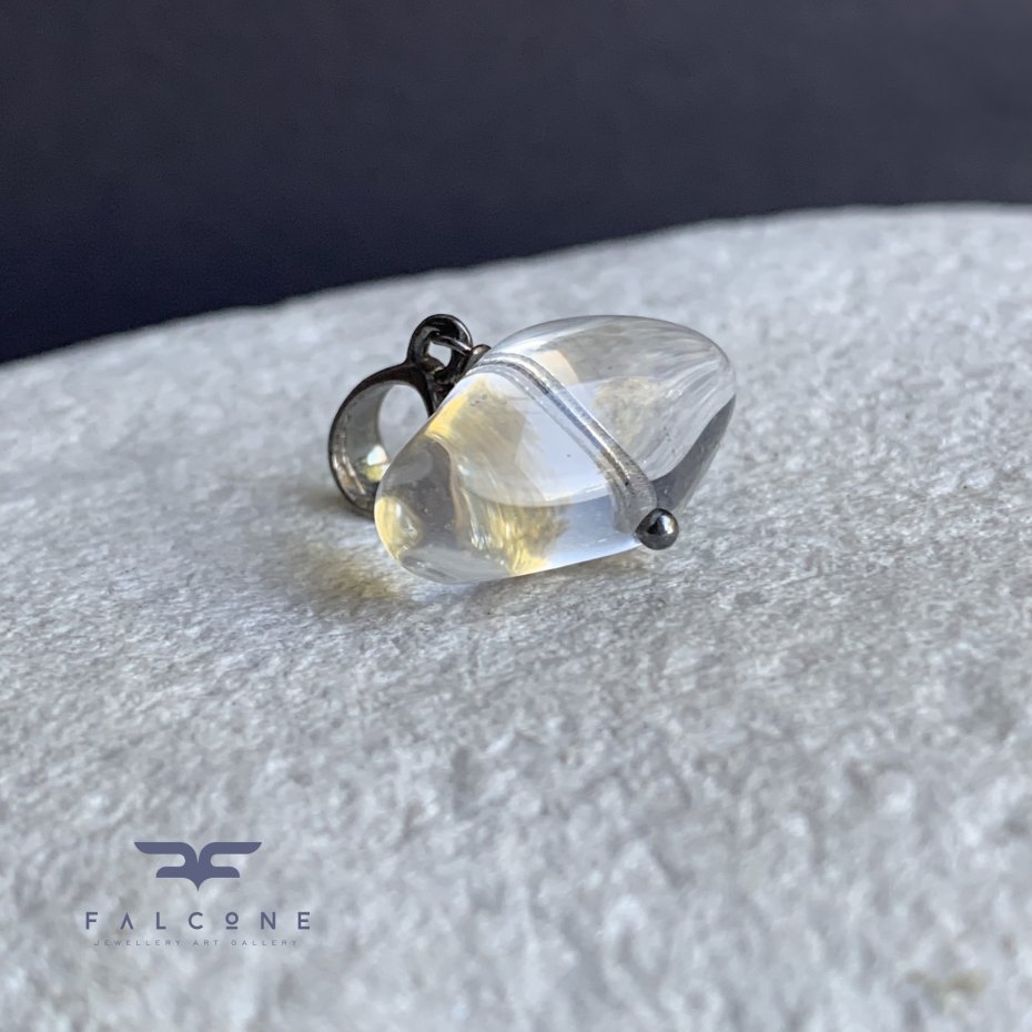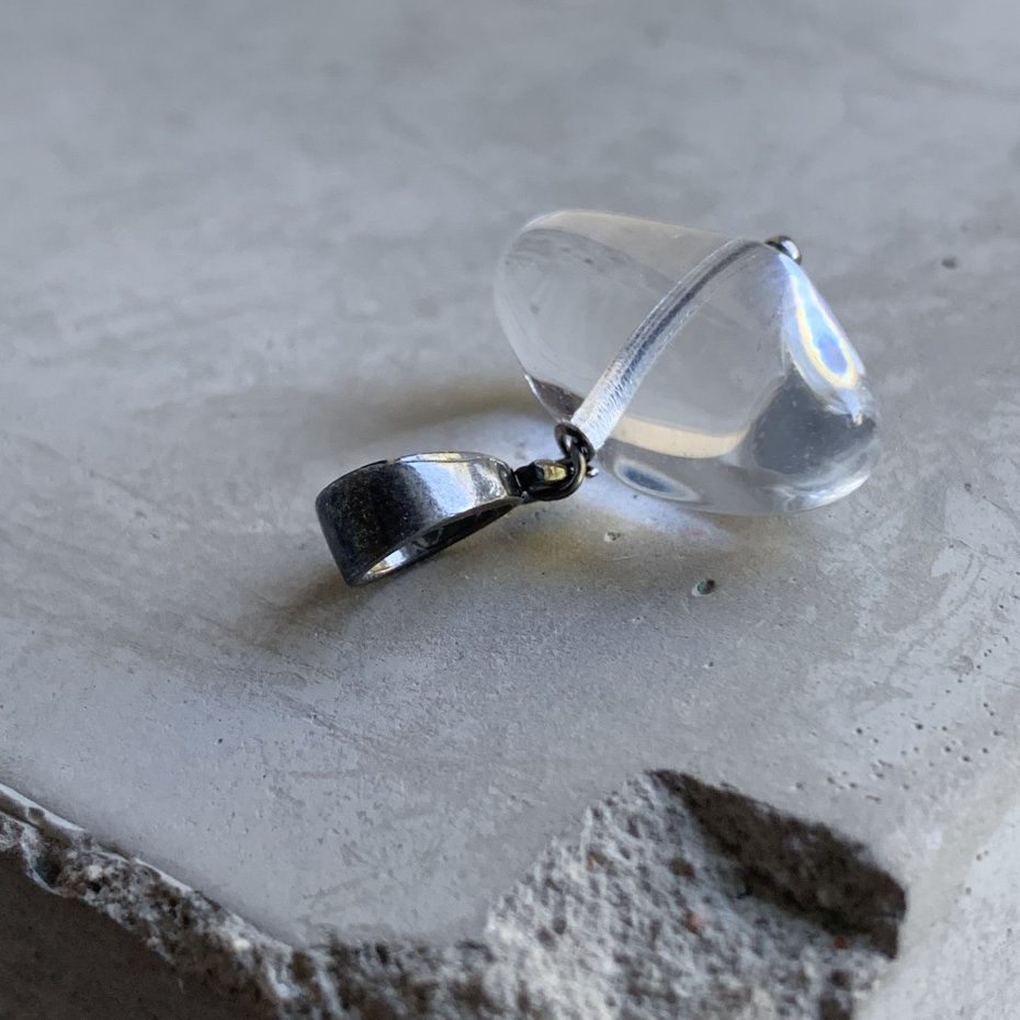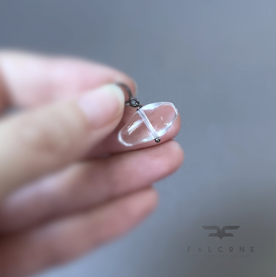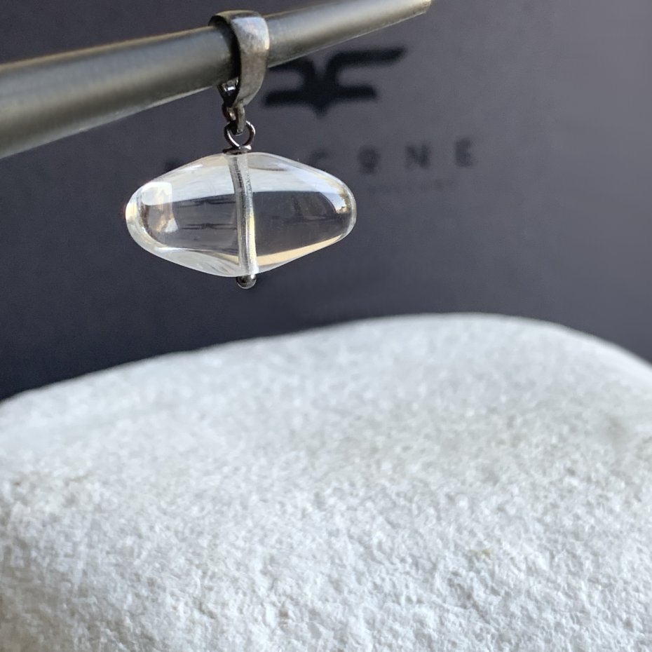 Zawieszka ze srebra i szkła. Przejrzysty szklany koralik ma nietypową formę, poziomej bryłki o gładkim szlifie. Szkło jest bezbarwne i całkowicie przejrzyste, prze co powiększa elementy tła, przyjmując ich barwę. Oprawa z ciemnego, lekko przetartego srebra 925 nadaje całości ascetycznego charakteru. Szerokość zawieszki to ok. 2 cm. Długość zawieszki to ok. 2,5 cm.