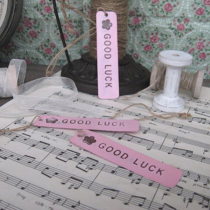 Malutka nowa metalowa zawieszka z napisem Good Luck. Wzór umieszczony po jednej stronie zawieszki. Kolor: różowy.