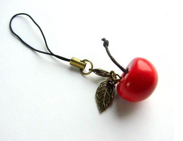 Słodka zawieszka do telefonu wisienka wykonana ręcznie z fimo, zabezpieczona werniksem. Wielkość wisienki ok 1,6 cm