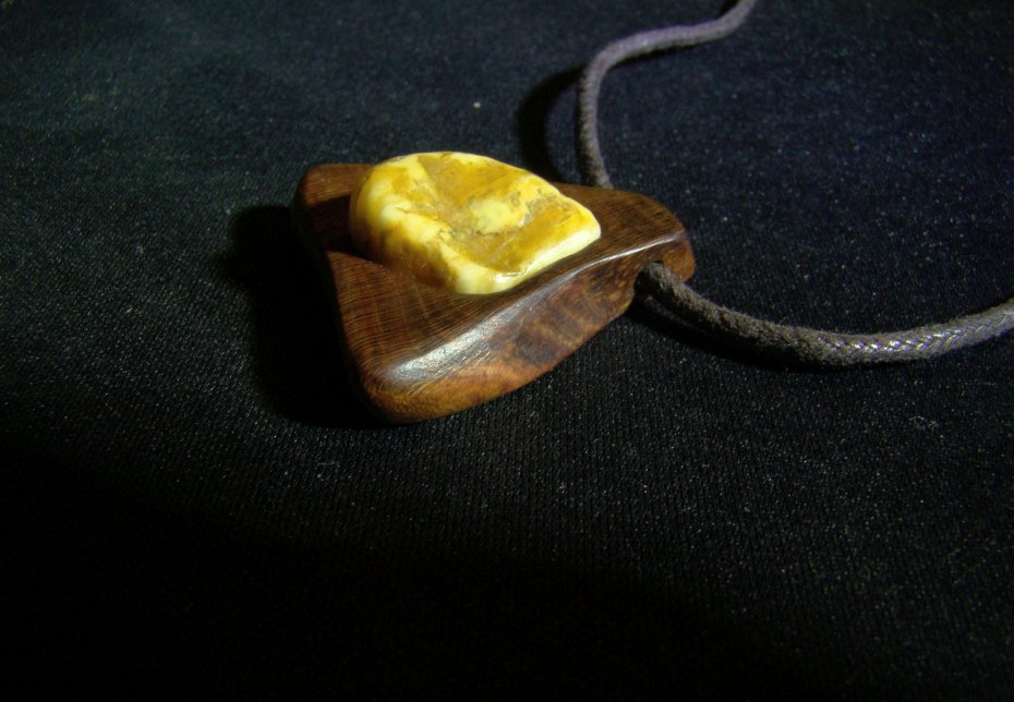 Wisior z drewna śliwy i bursztynu. Dosyć mały.