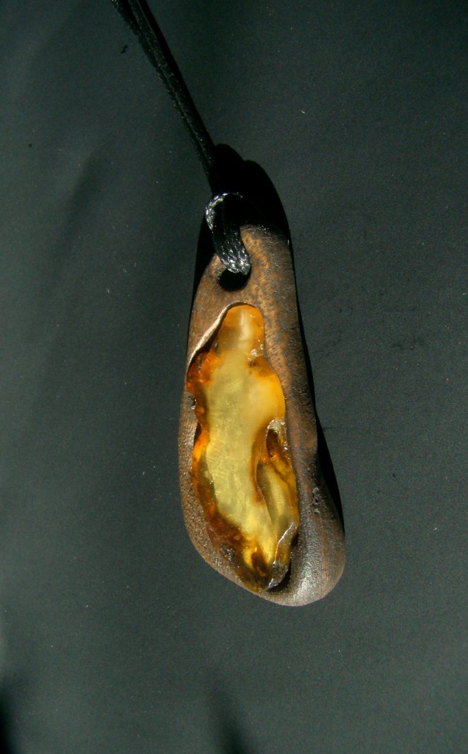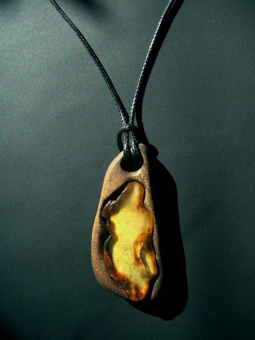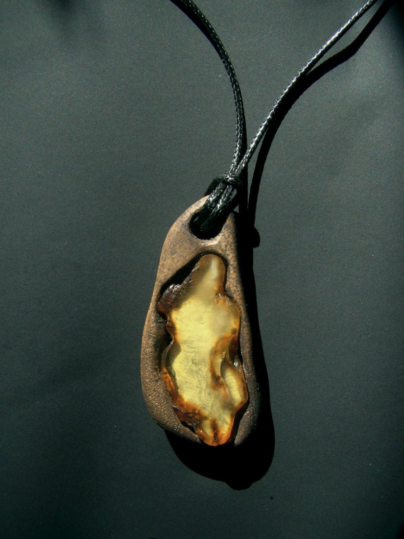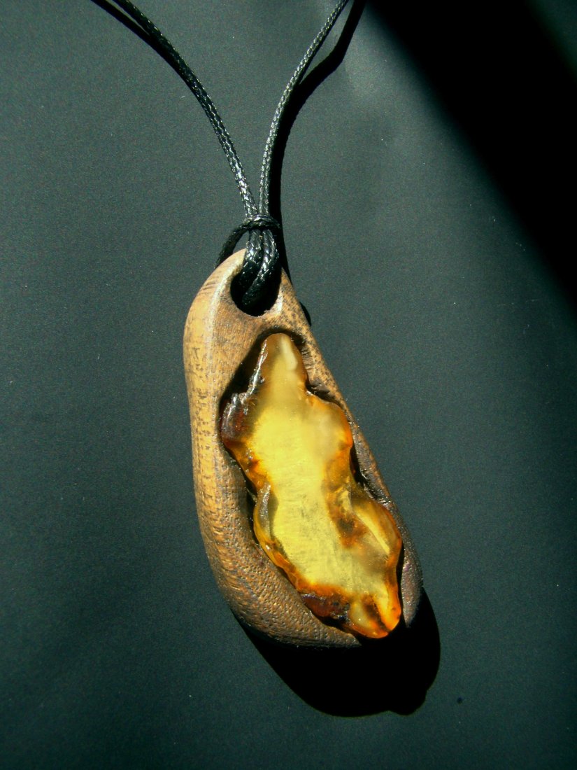 Wisior - zawieszka z drewna akacji (robinii akacjowej) i bursztynu.