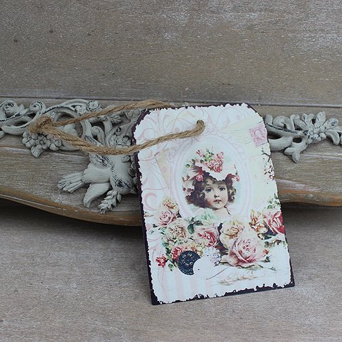 Piękna nowa metalowa zawieszka z motywem dziewczynki i róż.