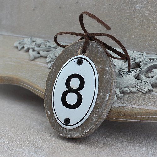 Drewniana zawieszka z metalowym numerem 8.