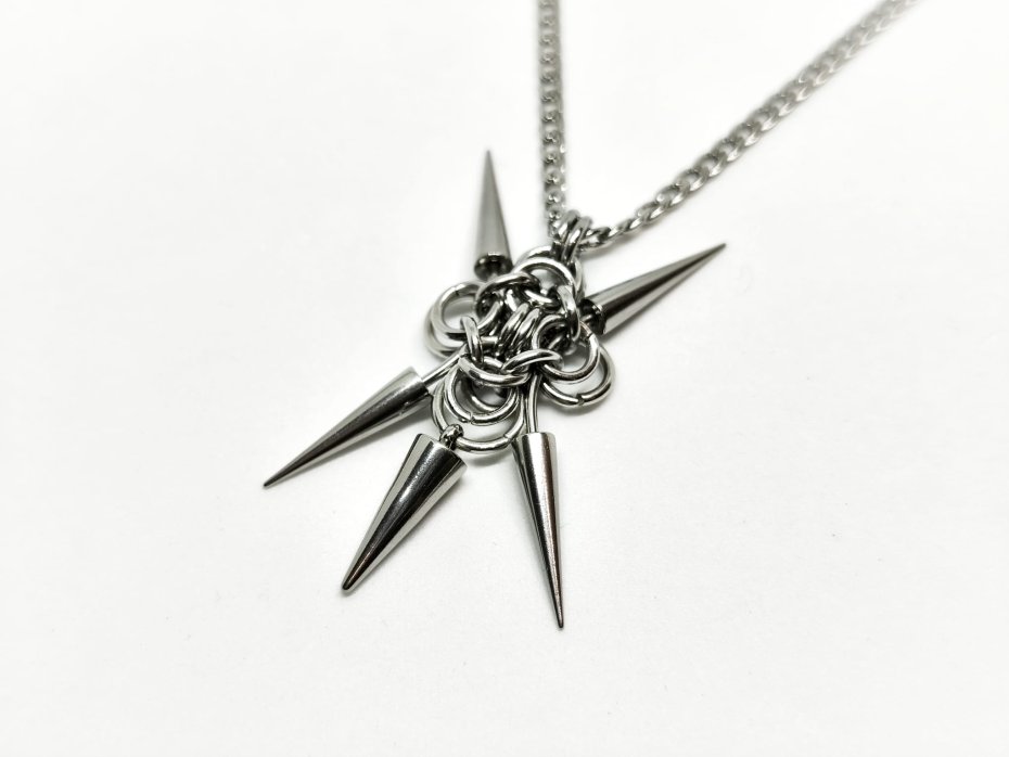 Surowa, agresywna zawieszka chainmaille – gęsty splot z ogniwek ze stali chirurgicznej 316L, centralny piercing z ostrymi kolcami ze stali nierdzewnej i błyszczące kuleczki. Całość ma ten chłodny, mechaniczny klimat – cyber goth, industrial, post-punk, dark futurism, zero delikatności, czysta stalowa moc i dystopijny pazur.