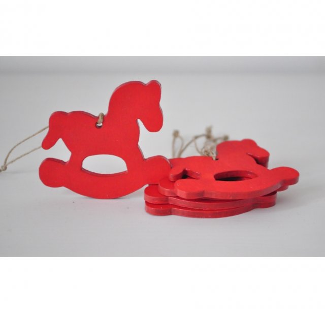 Komplet pięciu zawieszek w kształcie koników. Koniki zostały wycięte z drewnianej sklejki i pomalowane na czerwono. Zawieszone są na naturalnym sznureczku. Wym. ok. 6 cm x 6 cm
