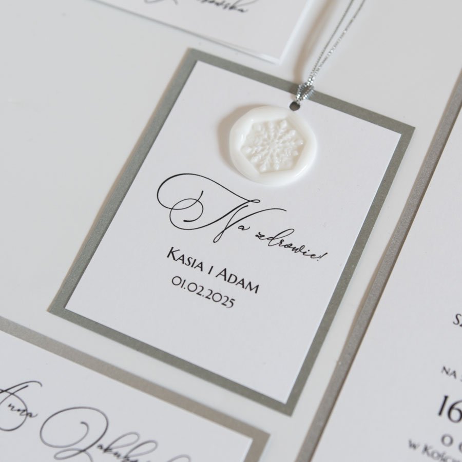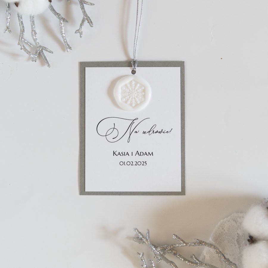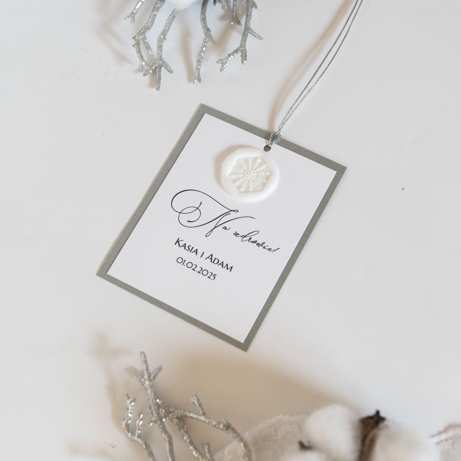 Zawieszki powstały z pięknego srebrnego kartonu o metalicznym połysku, wydruk ozdobiony jest białym odbiciem pieczęci ze wzorem śnieżynki. Na górze do zawieszki doczepiony jest srebrny sznureczek.