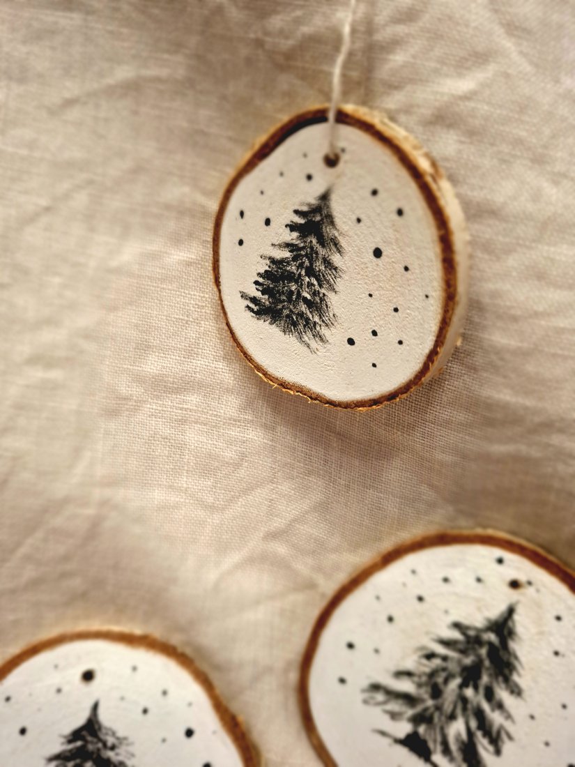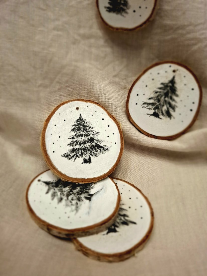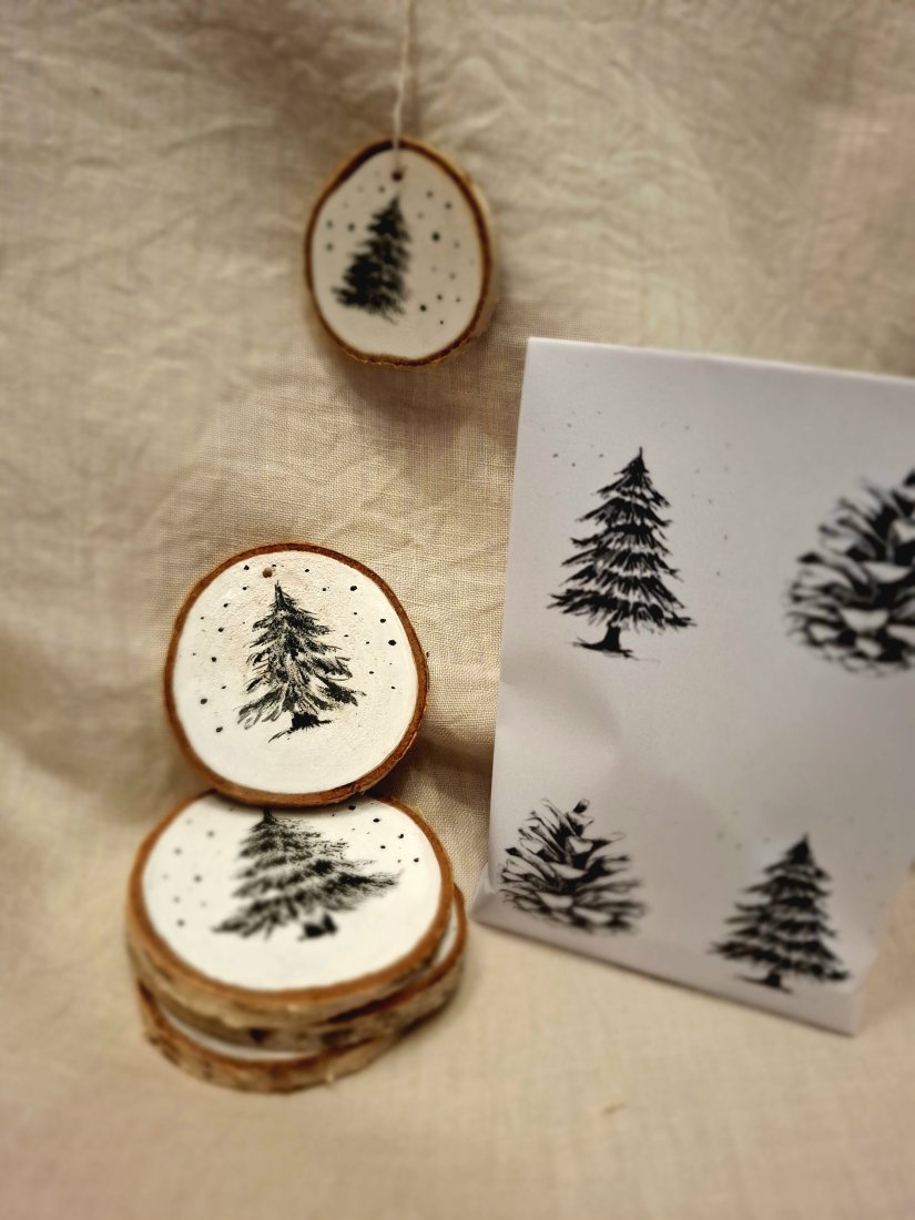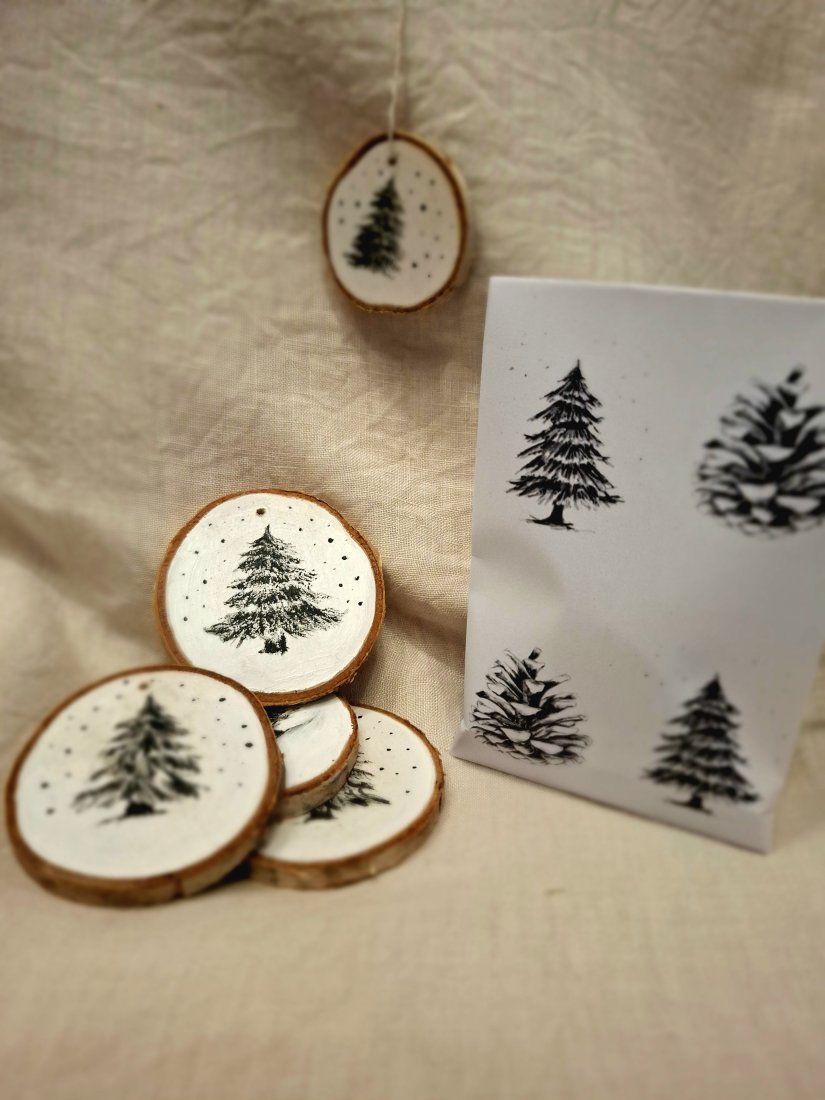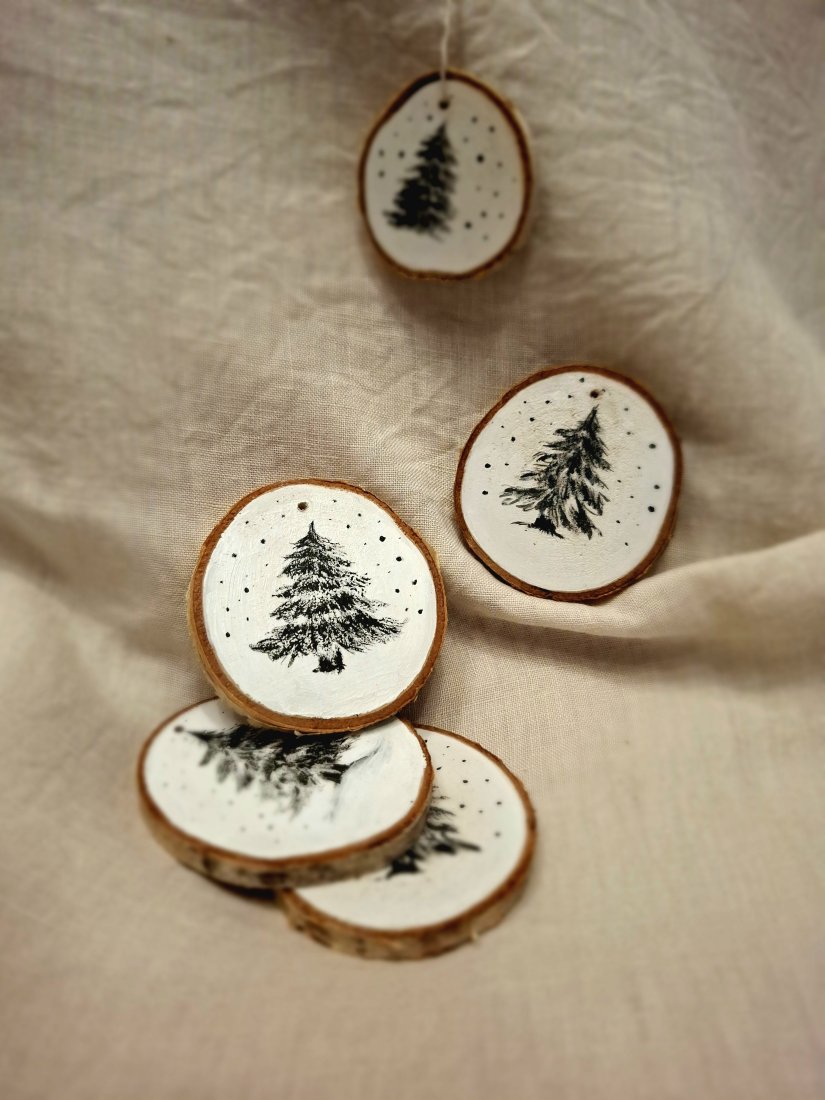 Drewniane zawieszki z motywem choinki.